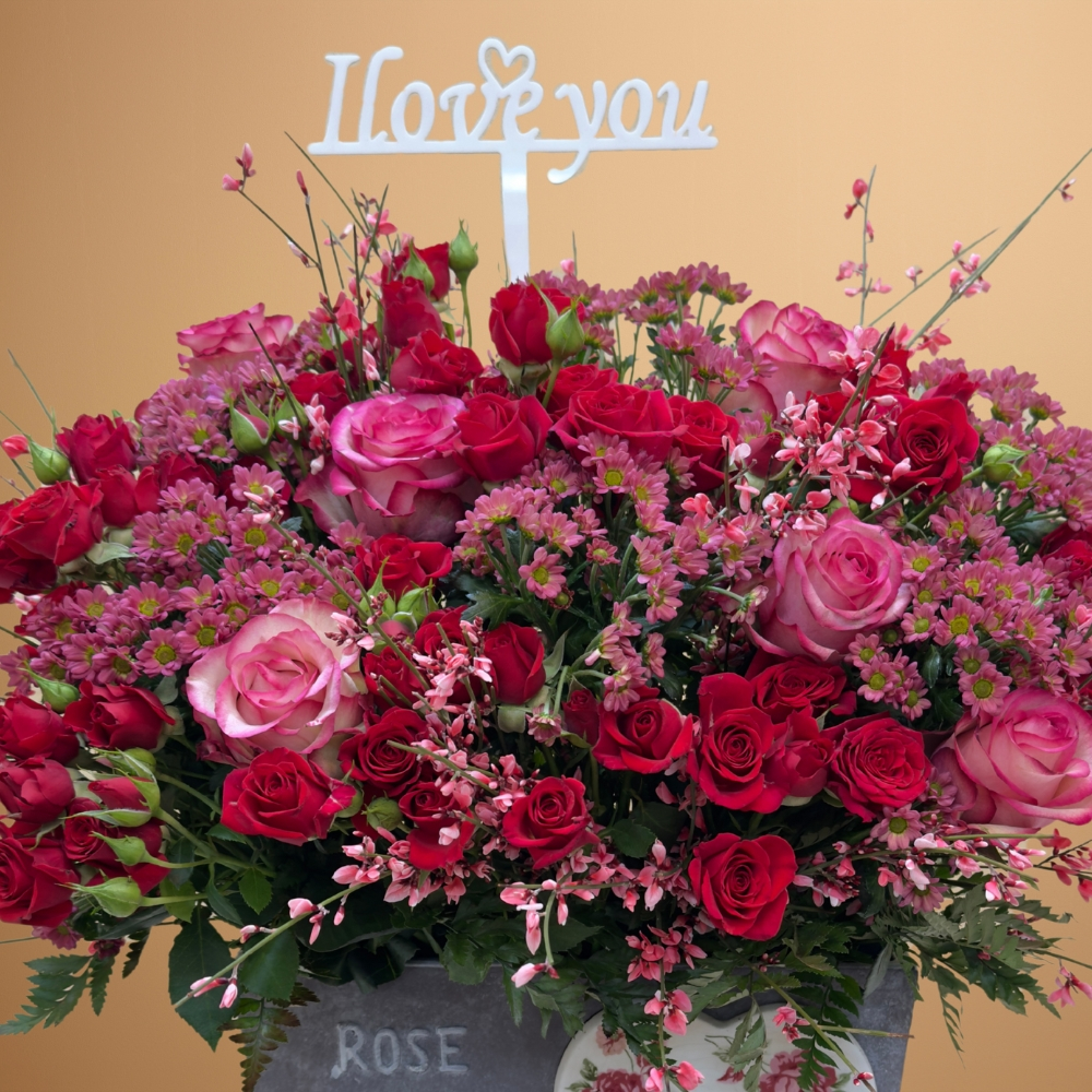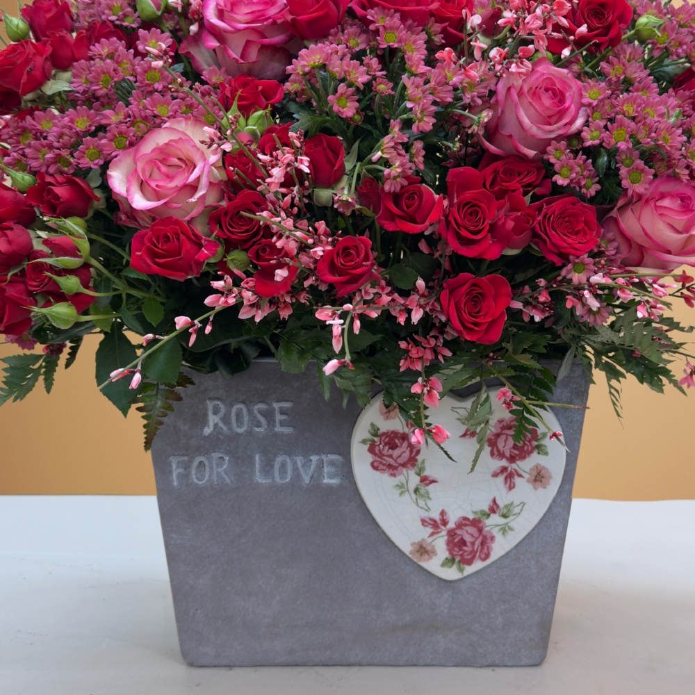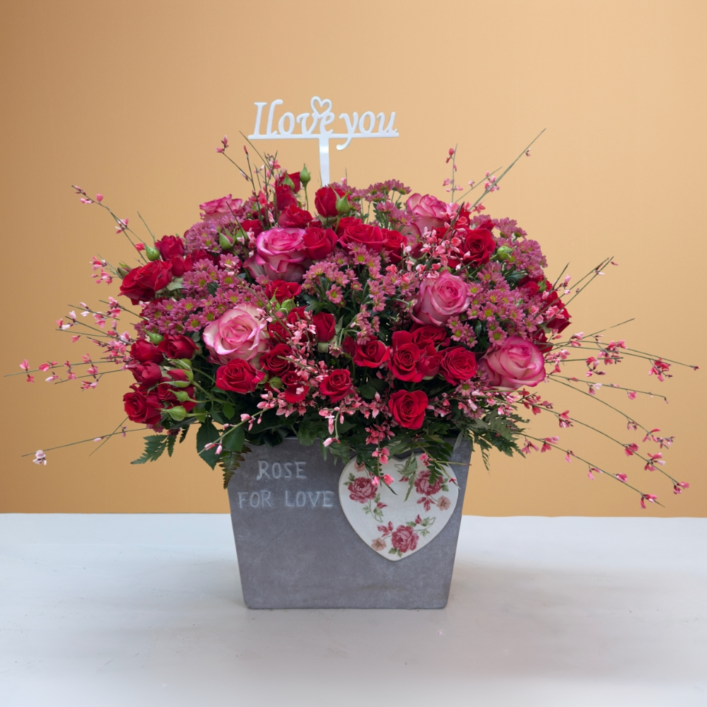 An elegant ceramic vase featuring spray roses and chrysanthemum flowers.