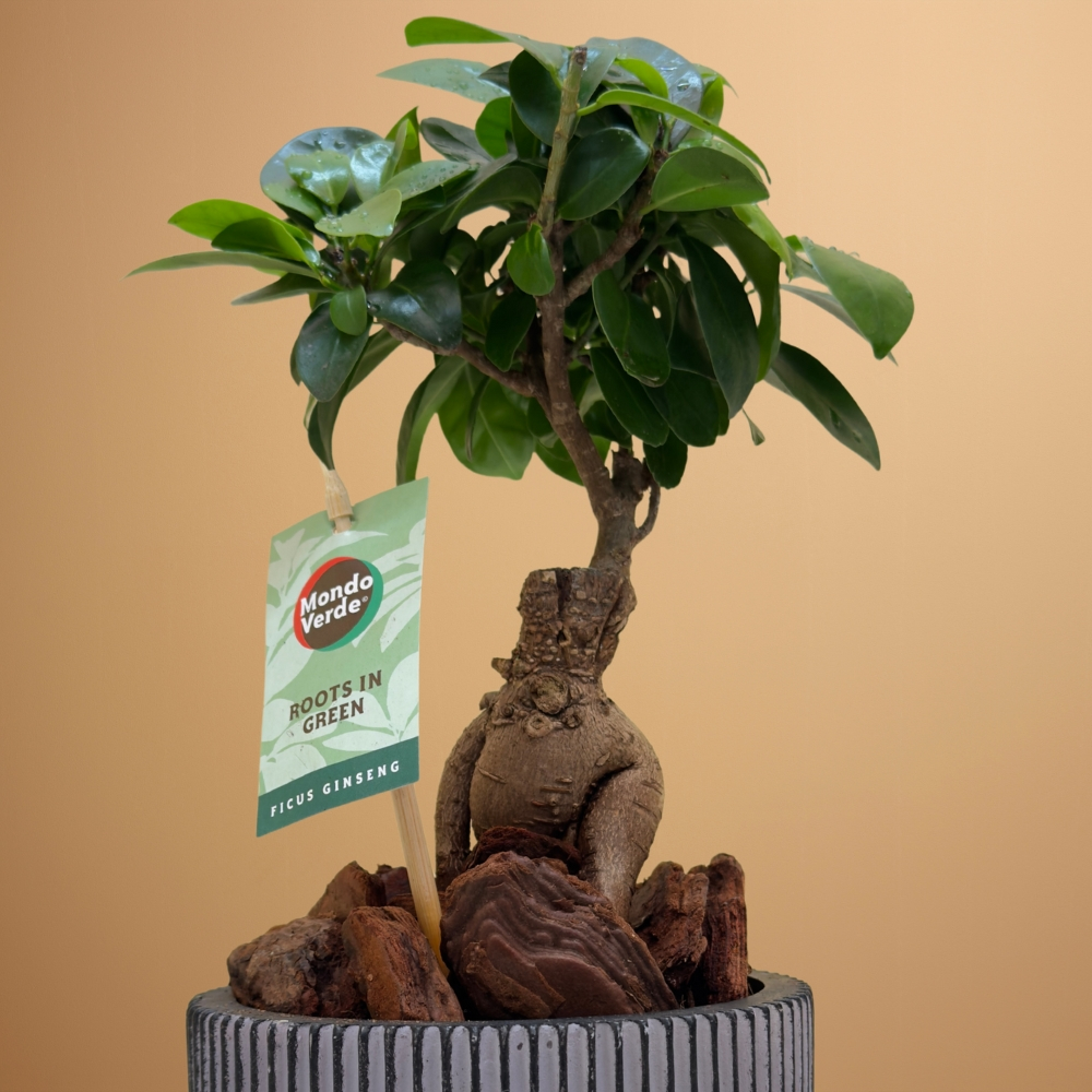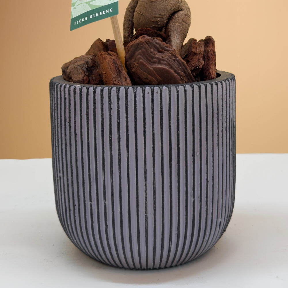 A groove Capi planter filled with bonsai ficus plants