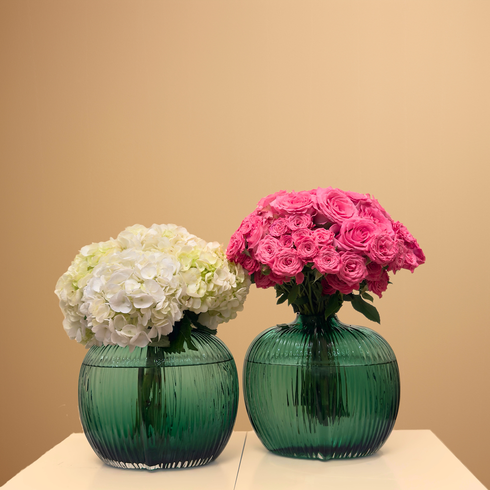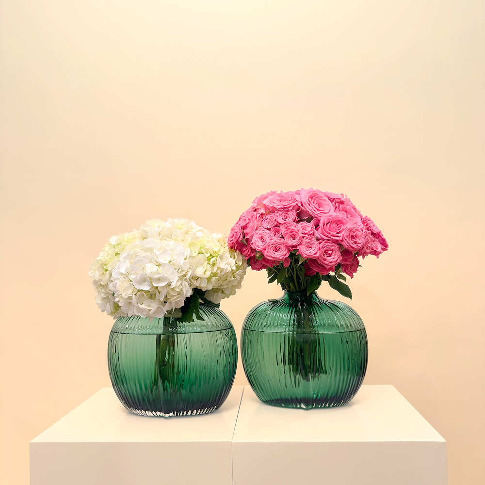 This bouquet is a set of 2 crystal glass vase that contains hydrangea, pink roses and baby roses.