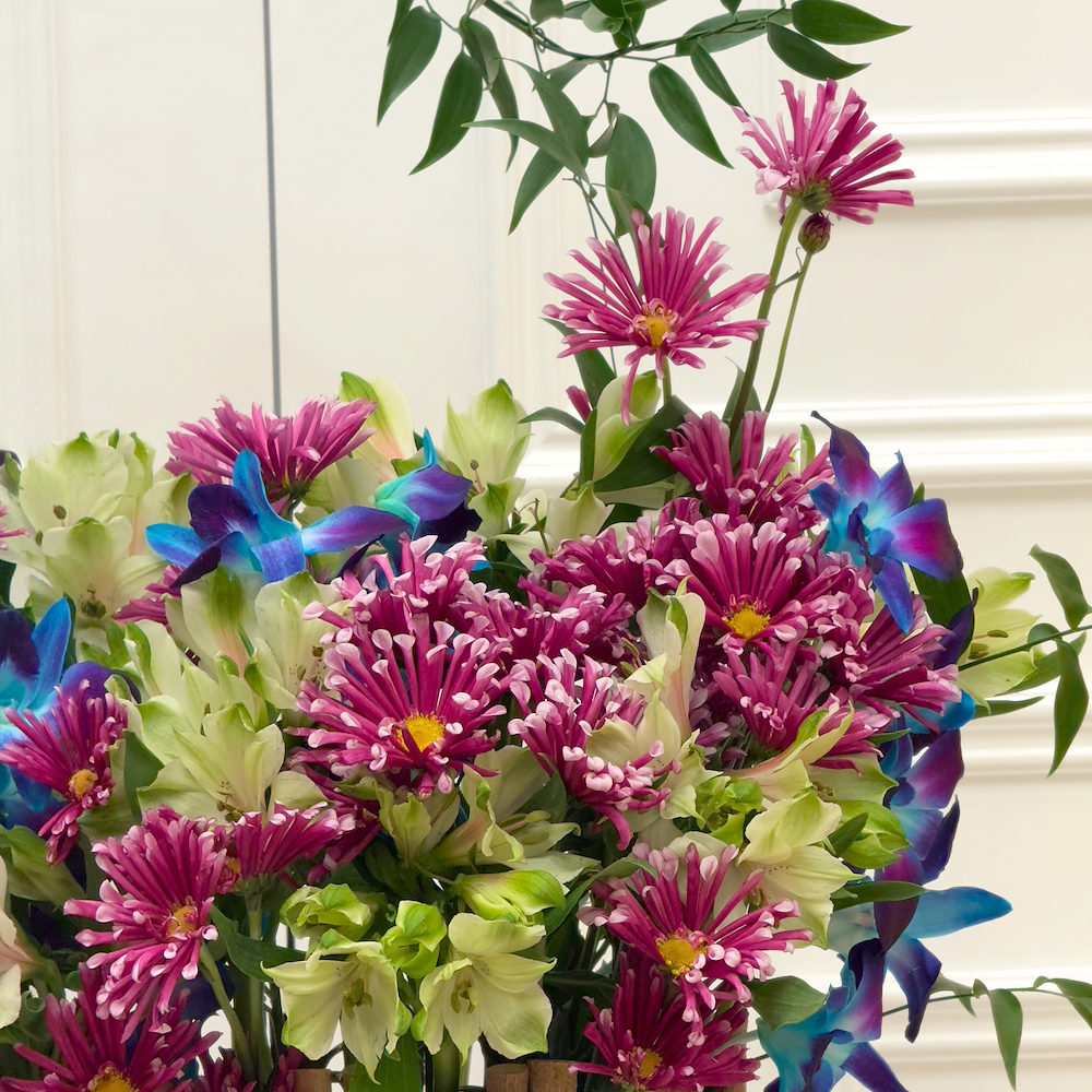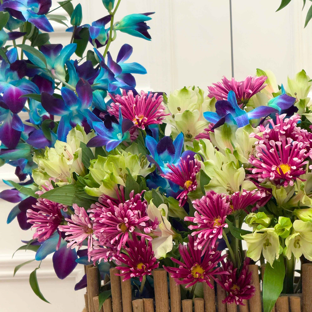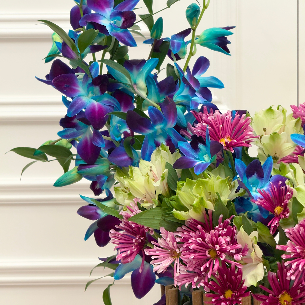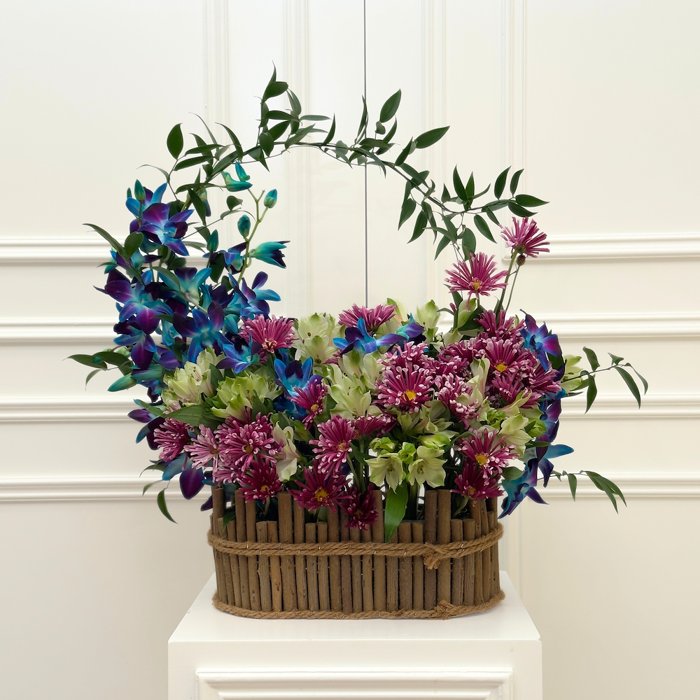 A woody oval basket filled with blue baby orchid, alstroemeria, and purple chrysanthemum flowers with elegant touches.