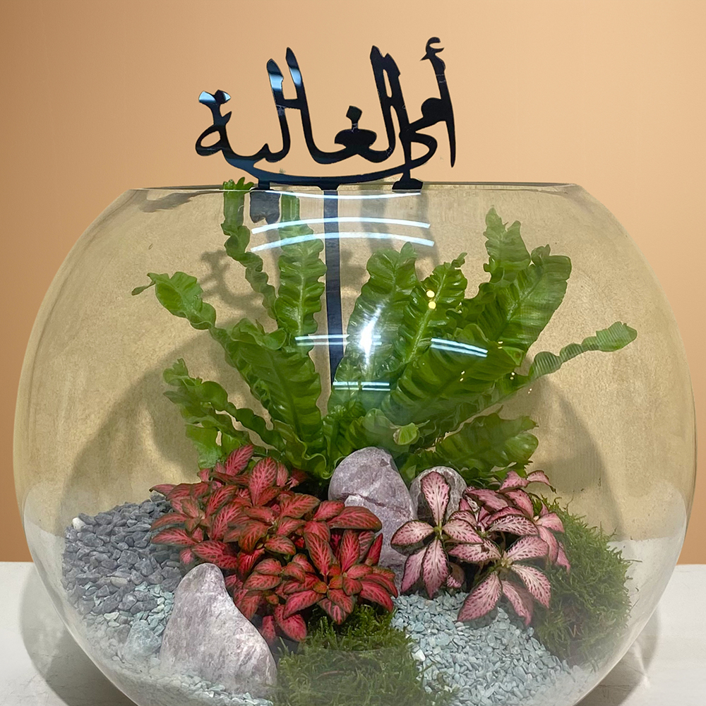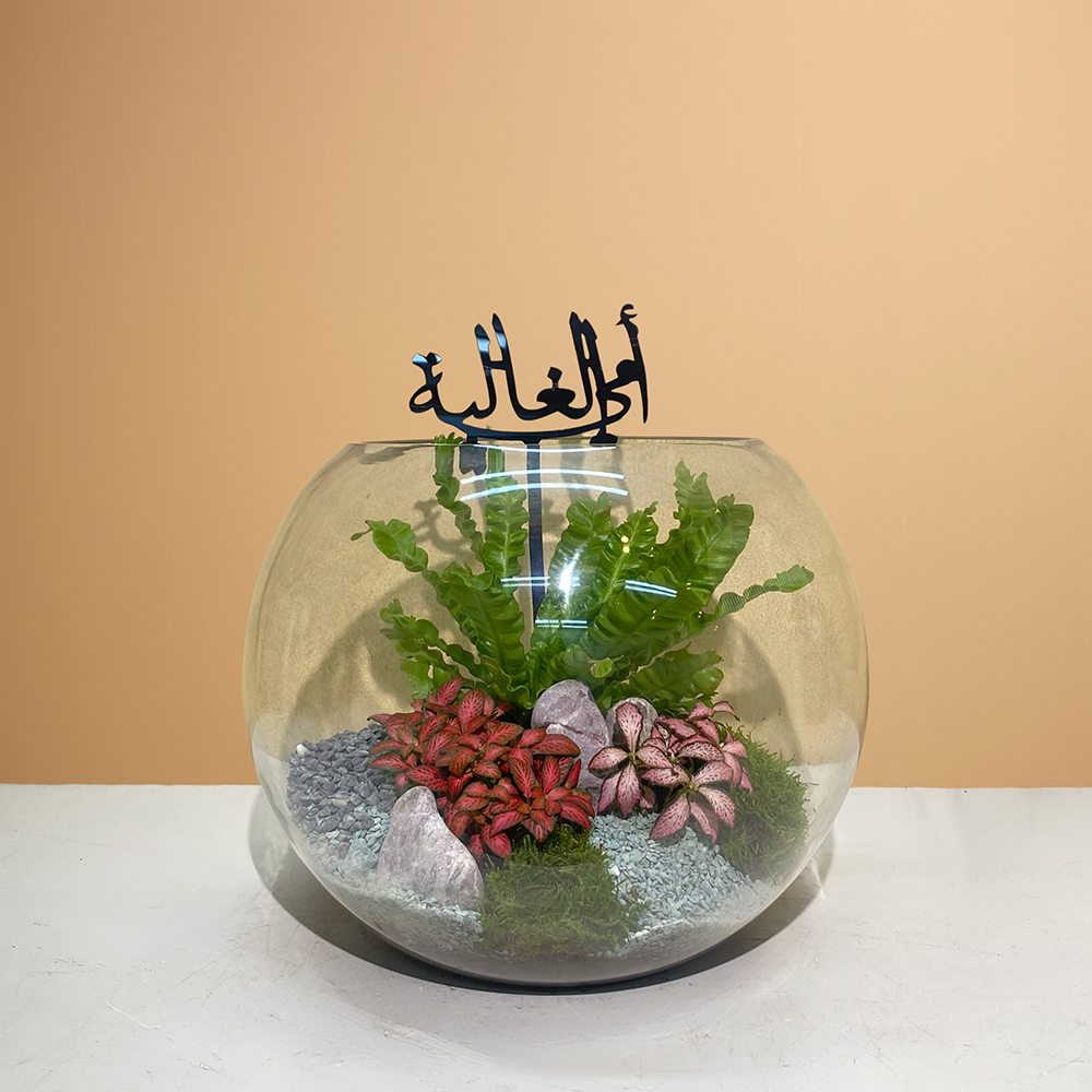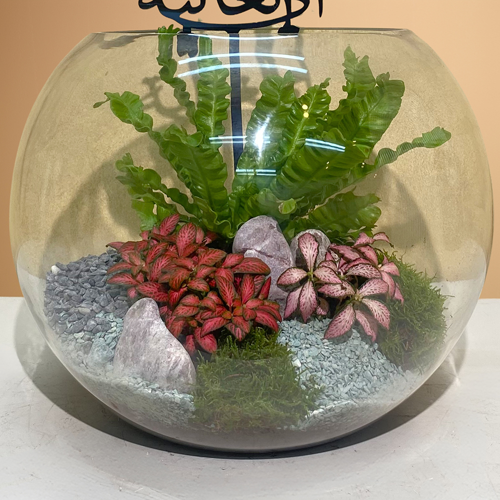 Asplenium and nerve plants in a glass bowl.