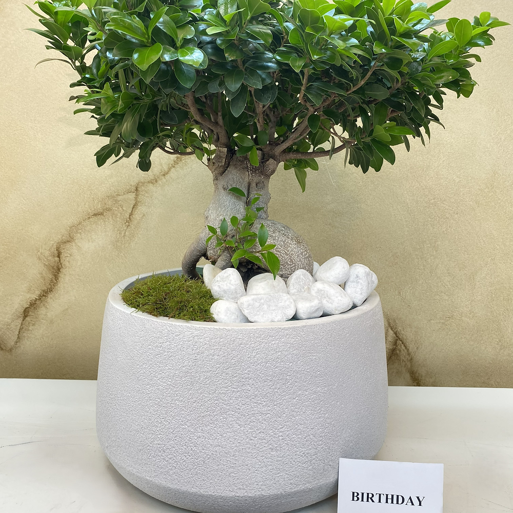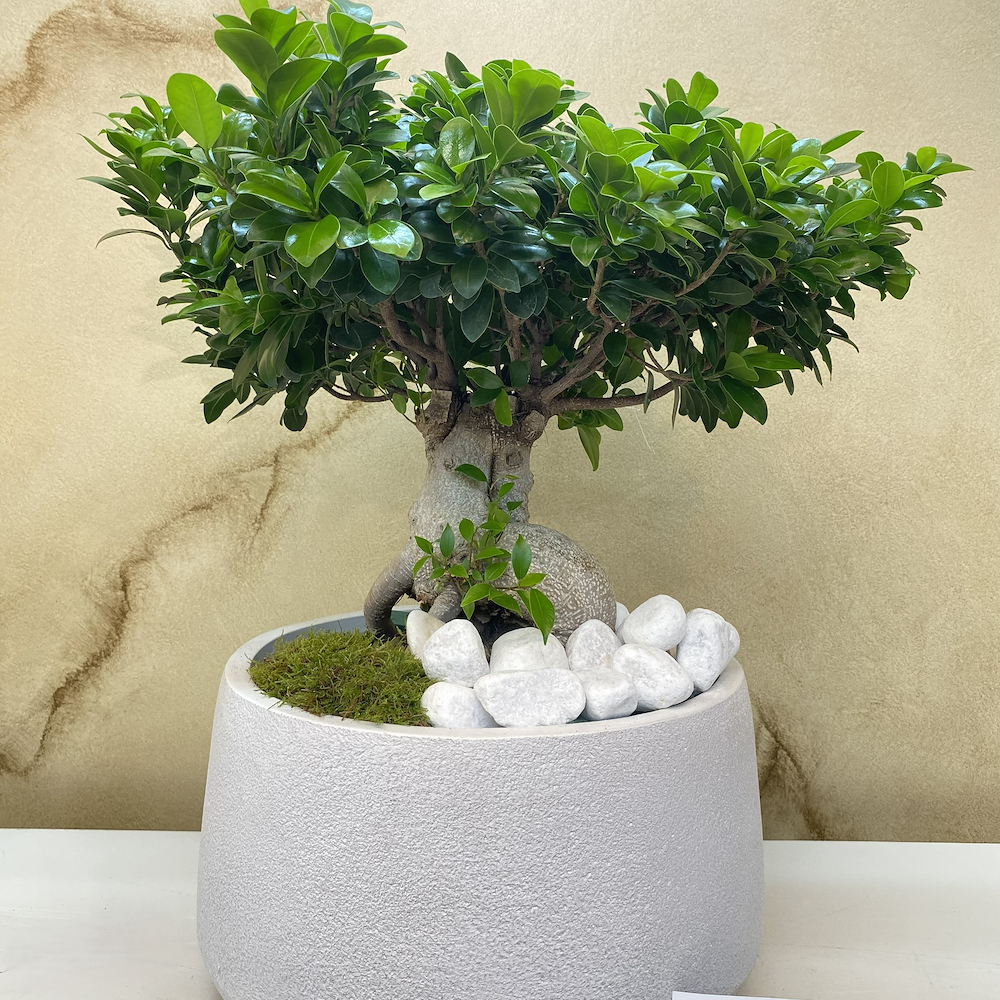 A large ficus gensing bonsai plant, planted in a white ceramic pot.
