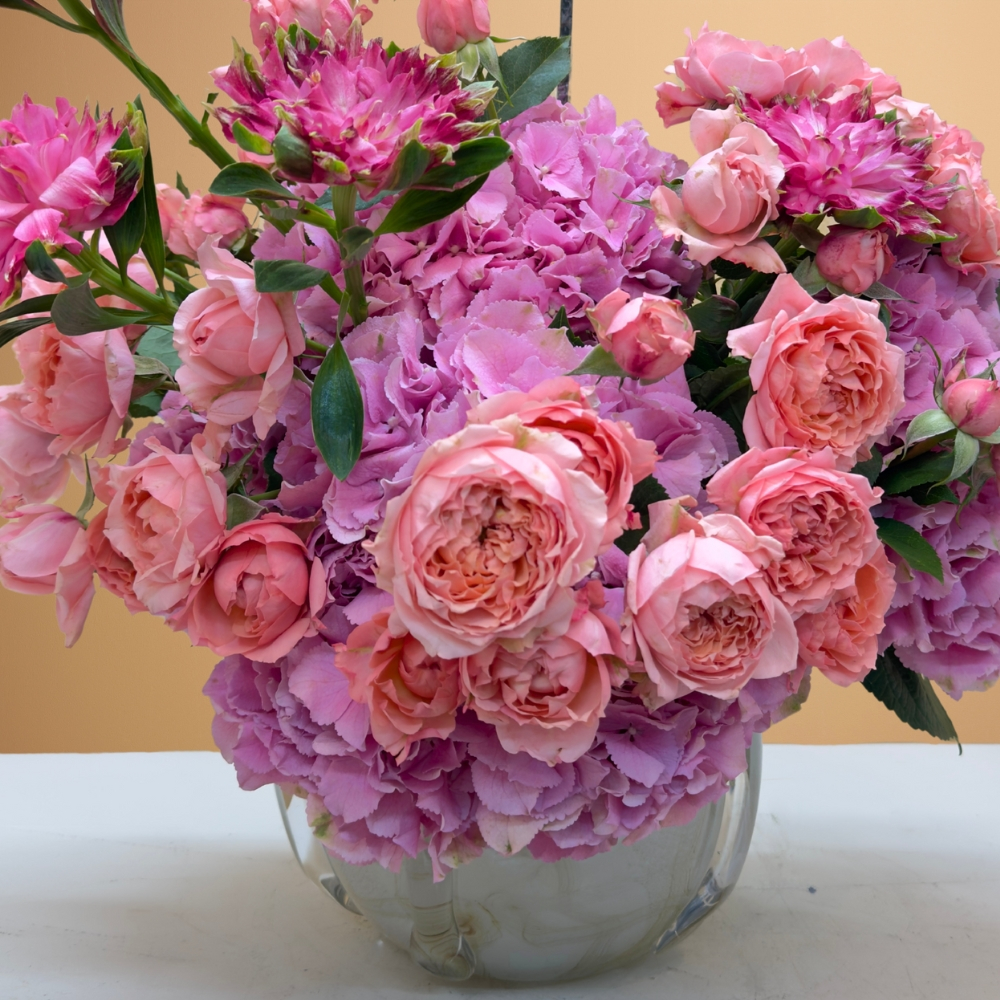 Juliet bonsai roses, pink hydrangeas, and alstroemeria arranged in a special glass vase.