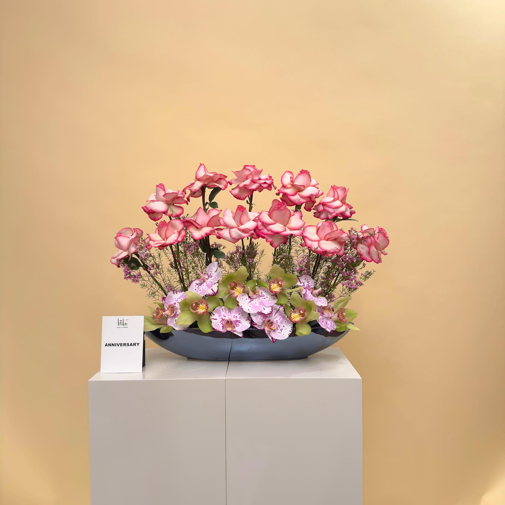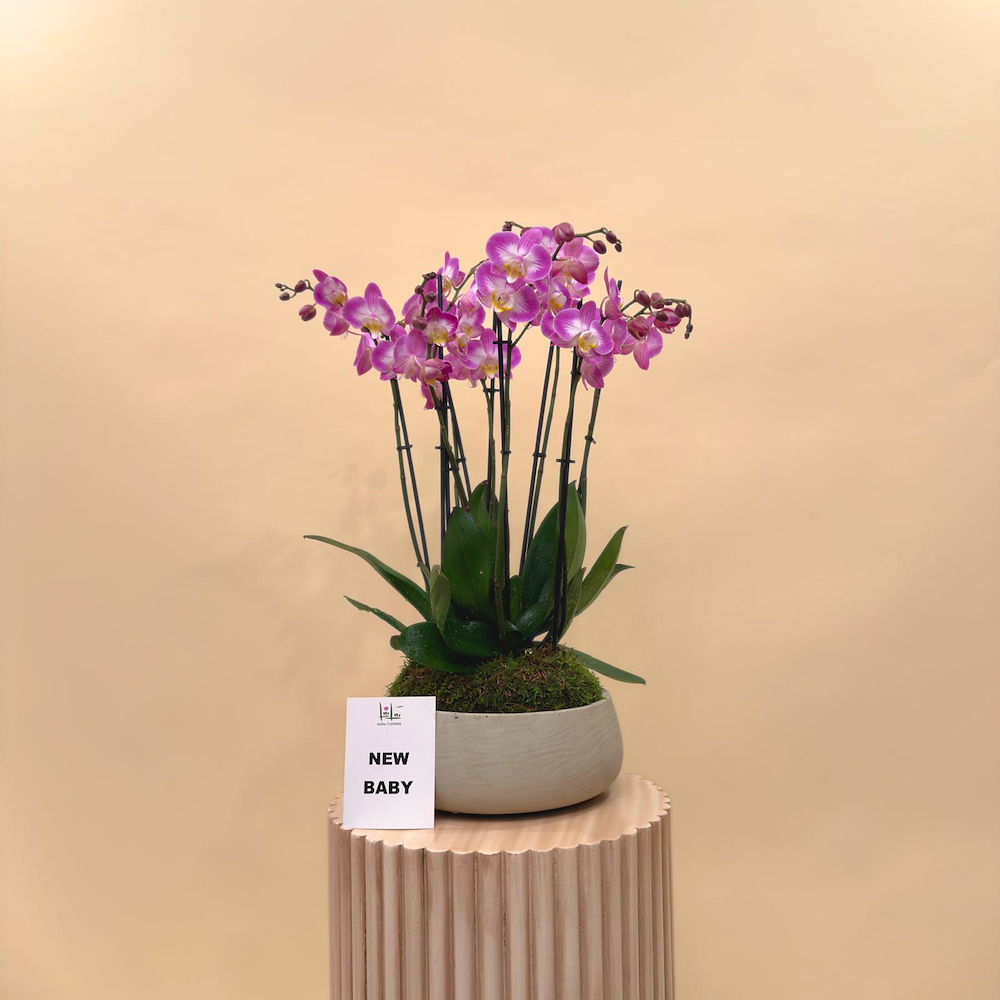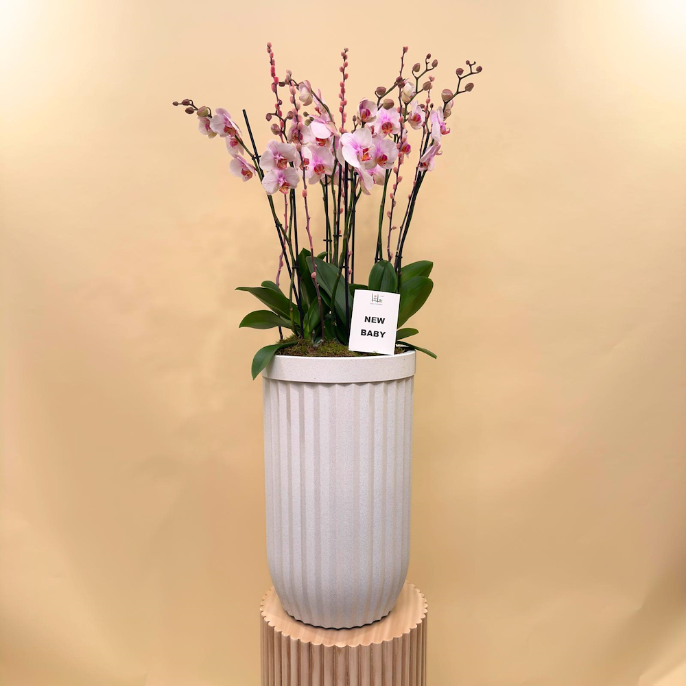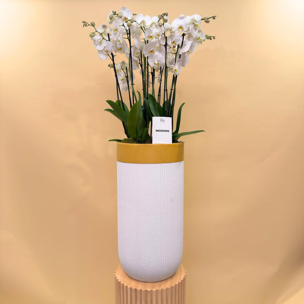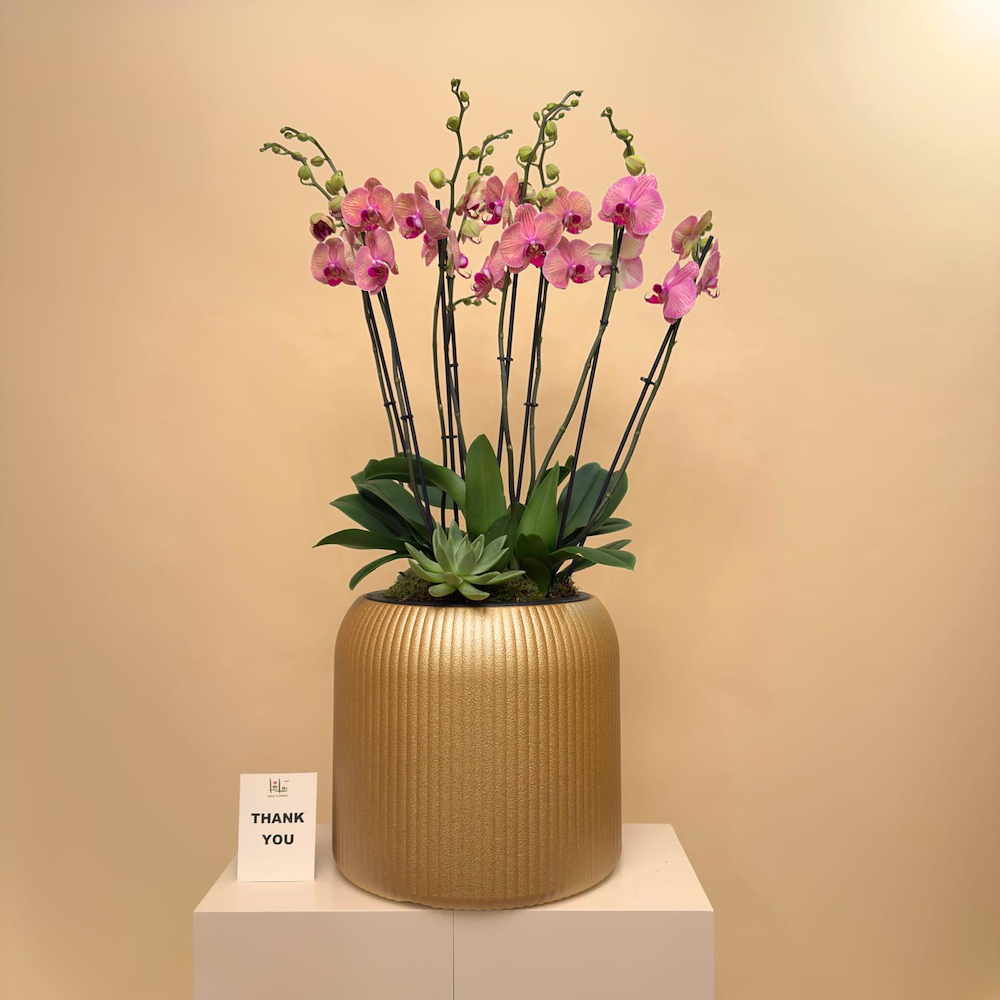 A golden fiber pot filled with leopard peach orchid plants and echeveria.