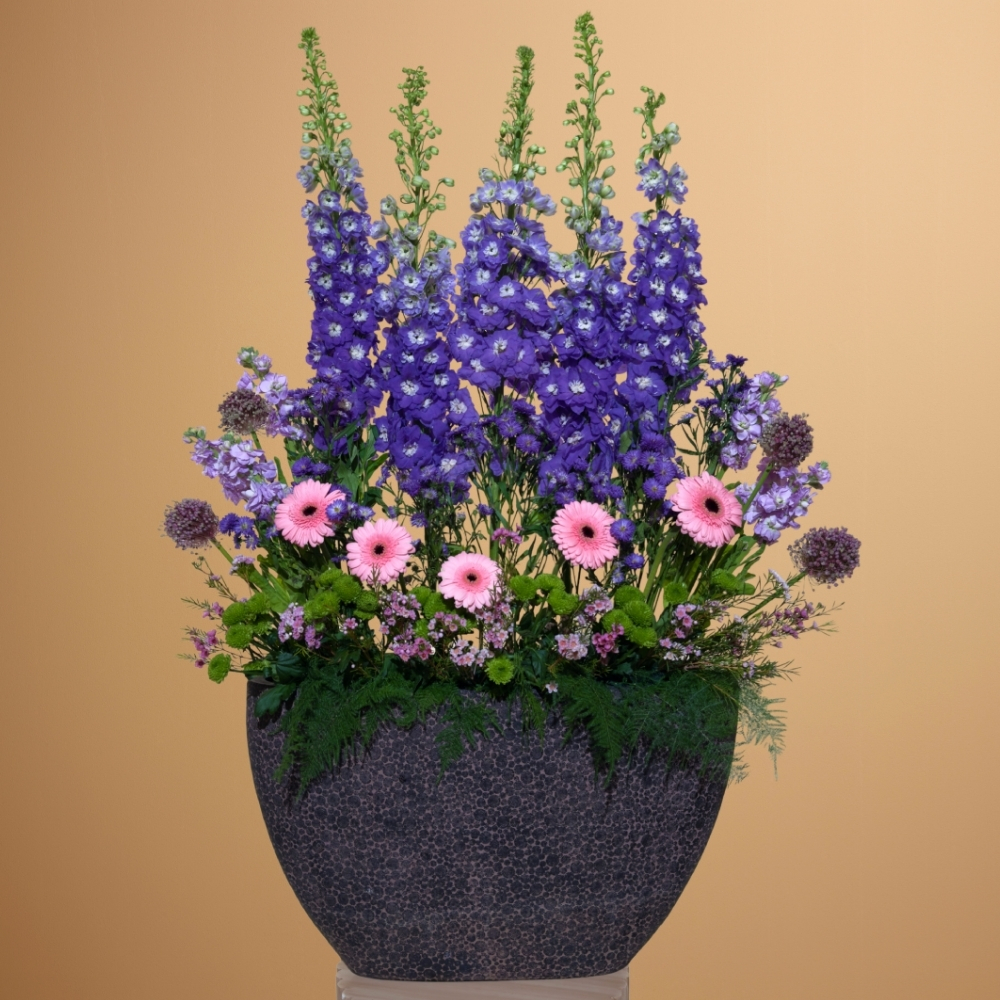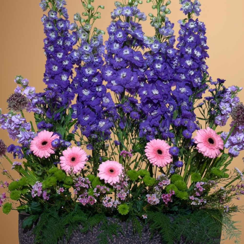 A bouquet containing purple delphiniums, pink gerberas, aster, and santini, arranged beautifully in a brown oval vase.