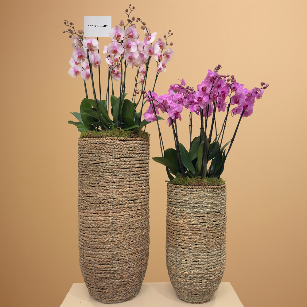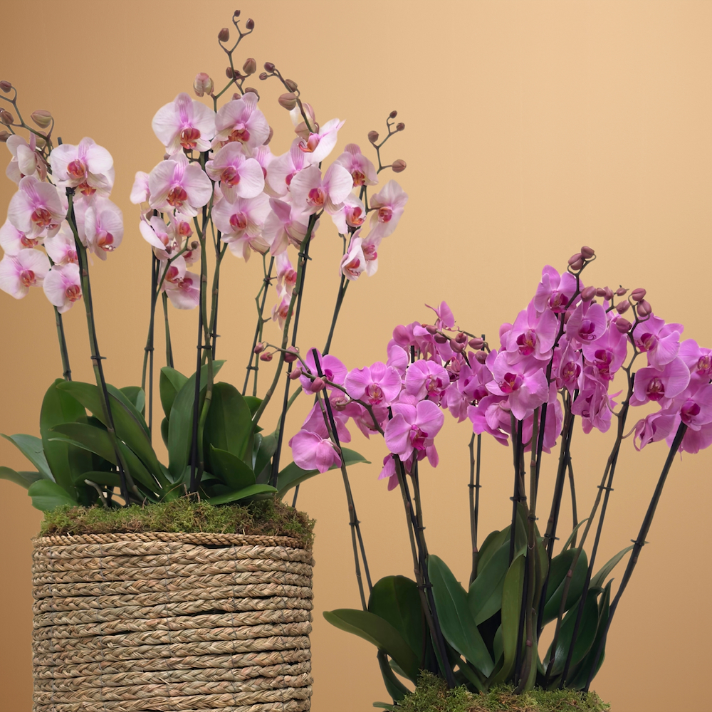 A set of 2 woven baskets containing pink and purple orchid plants, arranged beautifully.