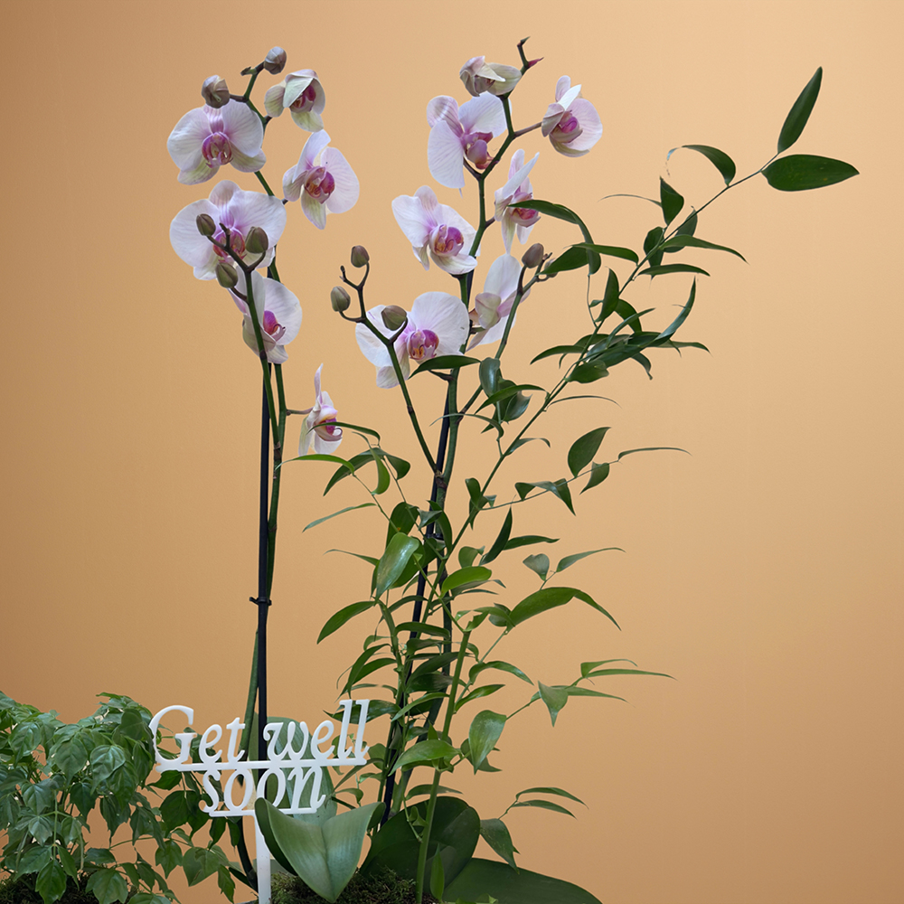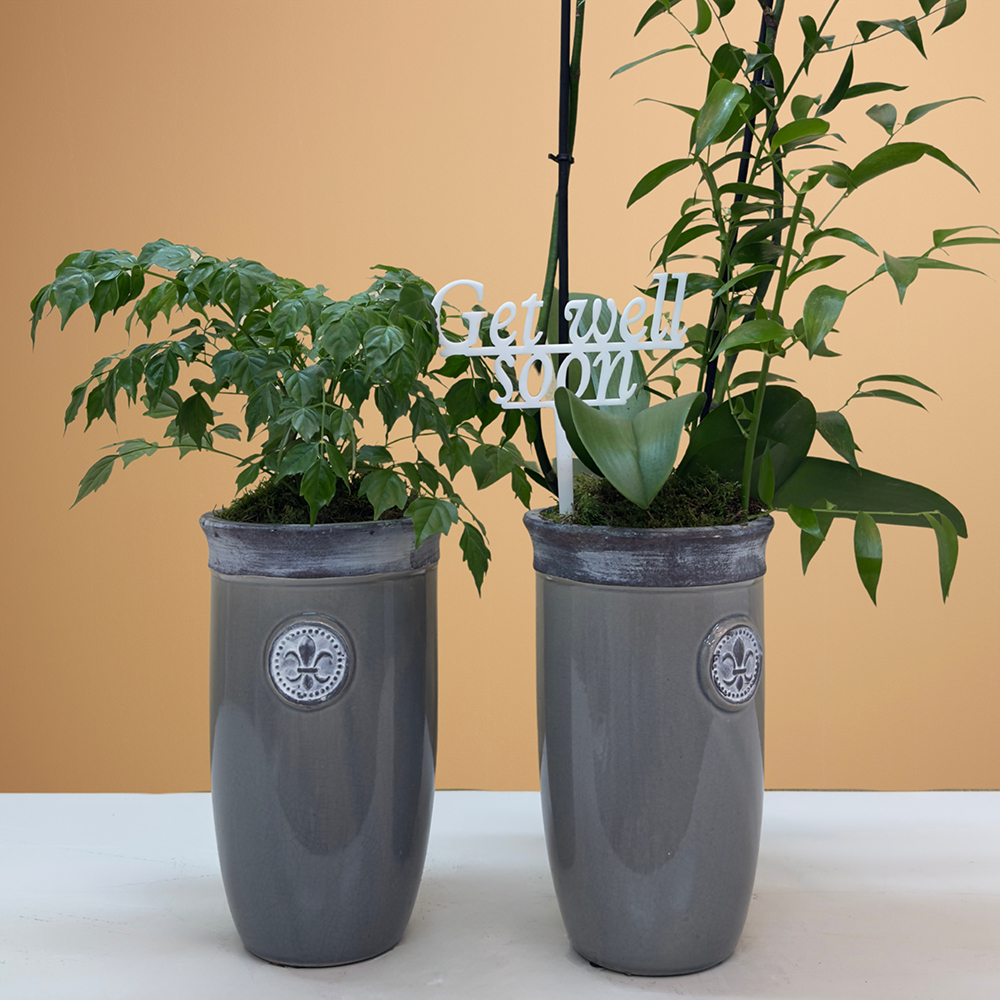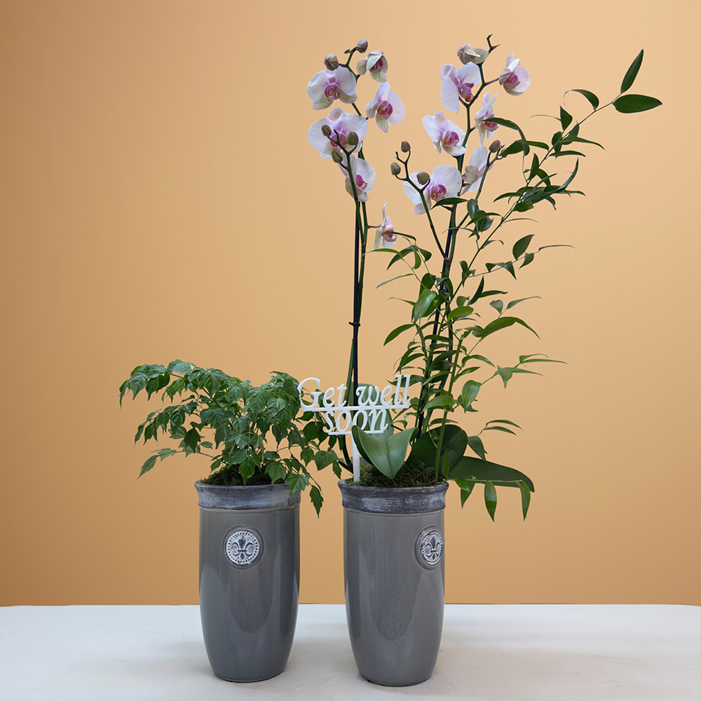 A set of 2 grey pots, elegantly arranged to display Madrid orchids and radermachera sinica plants, for a modern, stylish display.