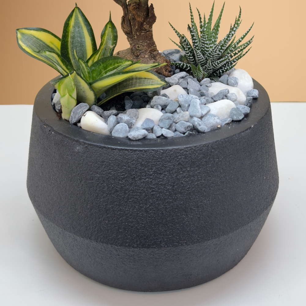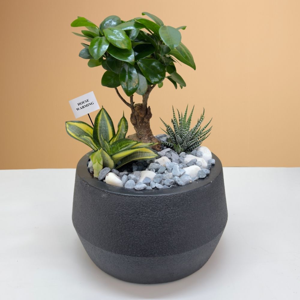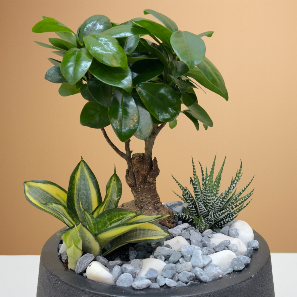 An elegant ceramic planter featuring mini ficus bonsai and sanseveria hahnii plants.