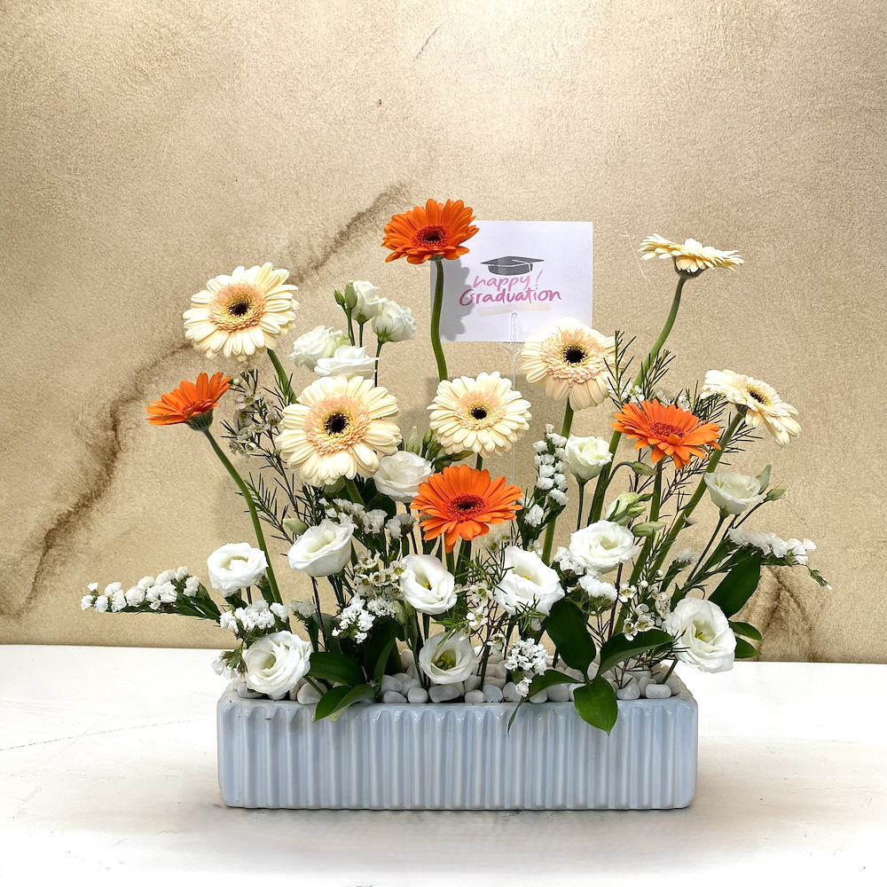 A ceramic vase that contains gerbera, eustoma and statice.