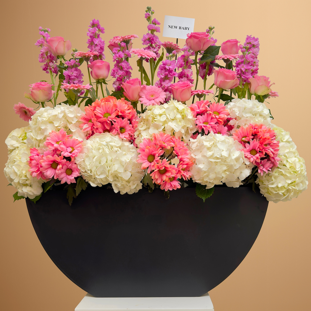 A bouquet of pink mathiola, white hydrangea, chrysanthemum, gerbera, all filled in a wooden oval vase.