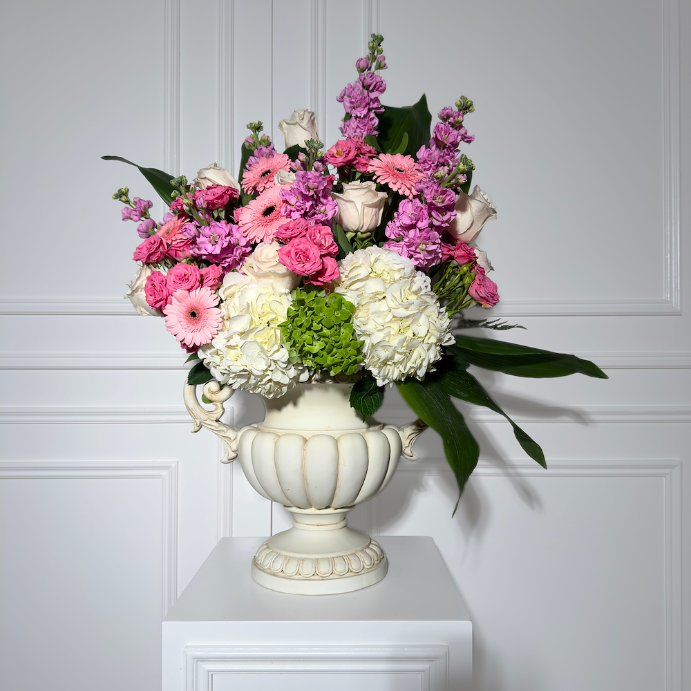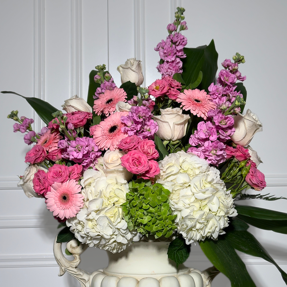 A vase filled with roses, gerberas, hydrangeas and matthiolas.