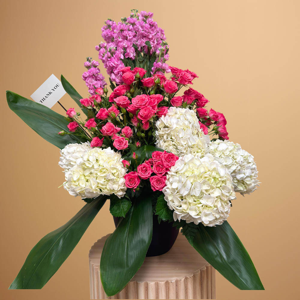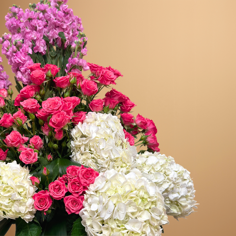 A vase filled with roses, matthiolas and hydrangeas.