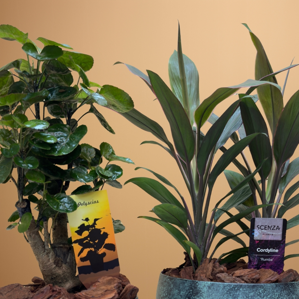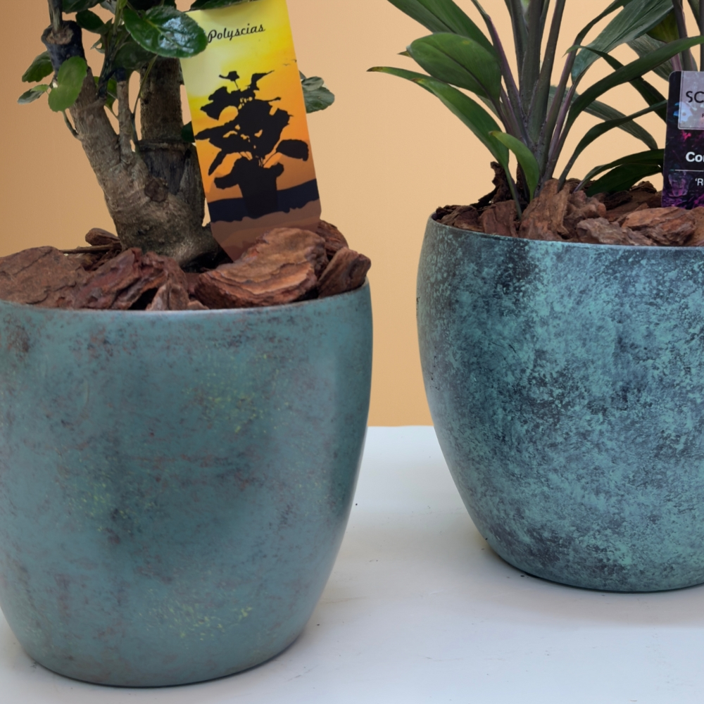 A set of polycias and cordy plants, arranged in a green tin pot.