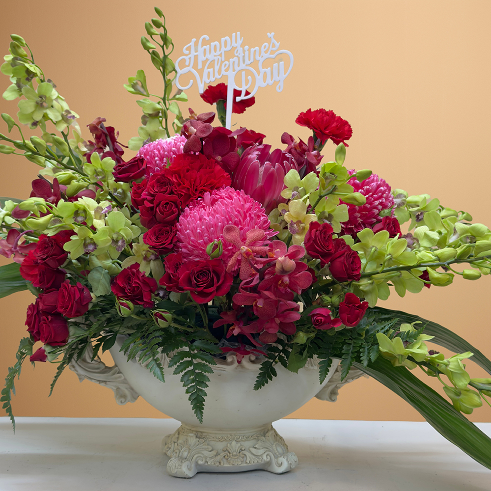 A striking arrangement of protea, baby roses, carnations, mokara orchids, and chrysanthemums, beautifully displayed in a sandstone vase.