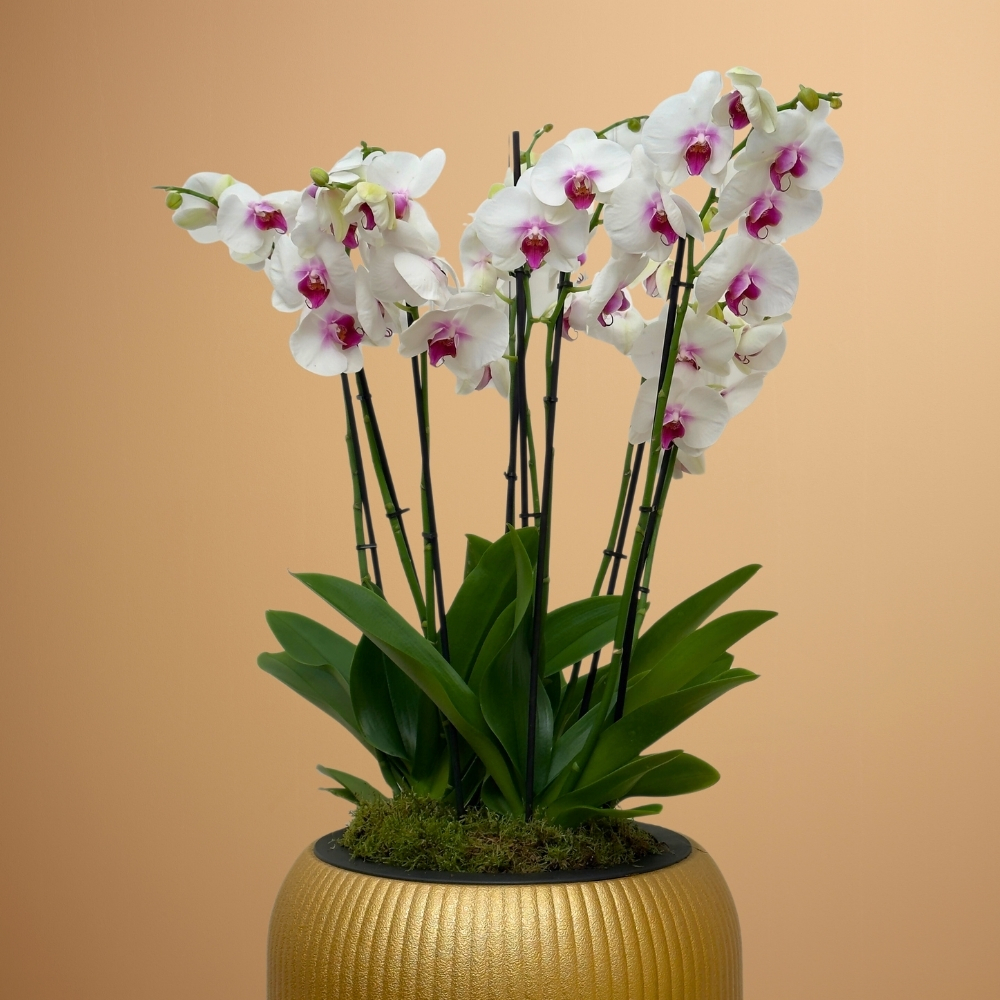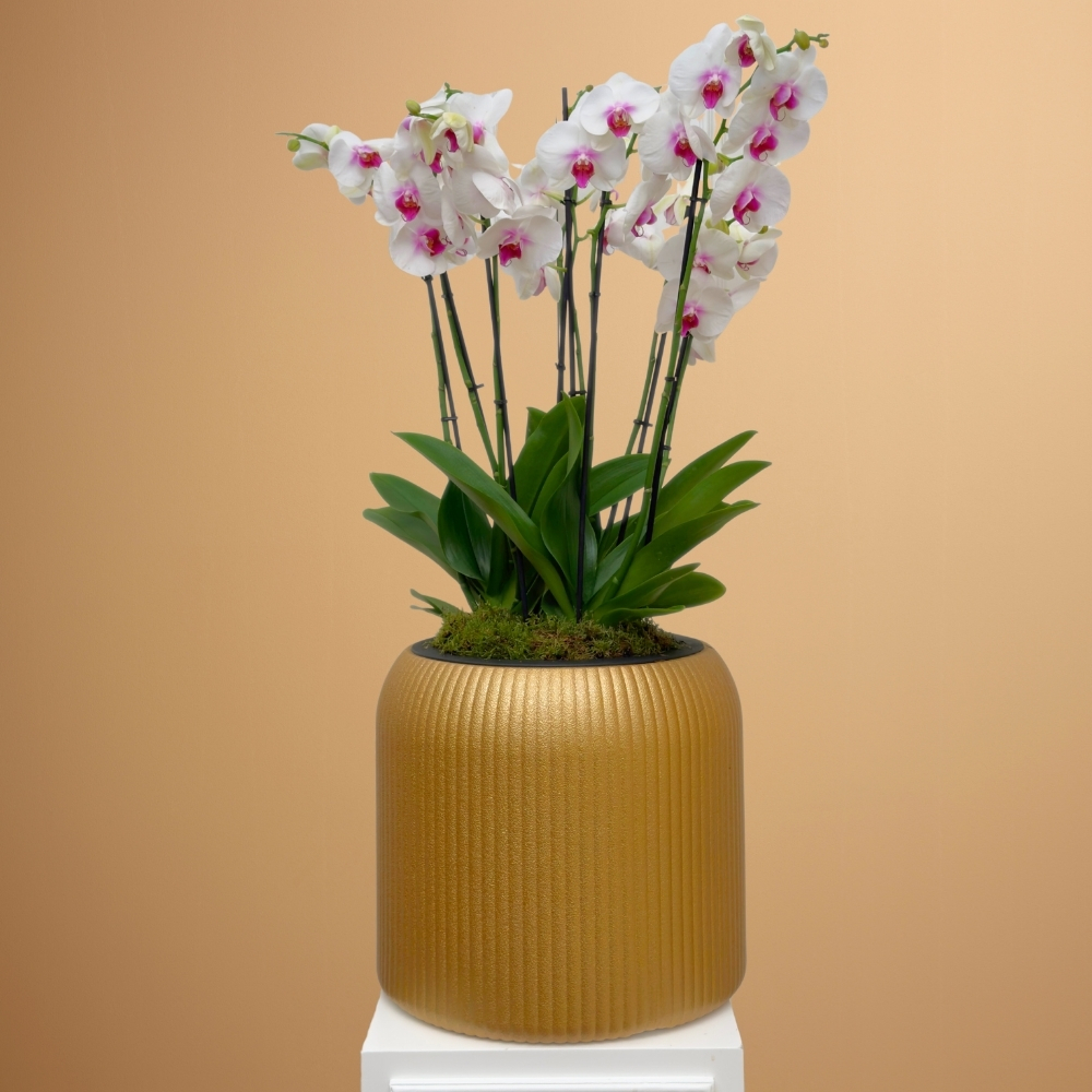 A planter that contains red lips orchid plants.