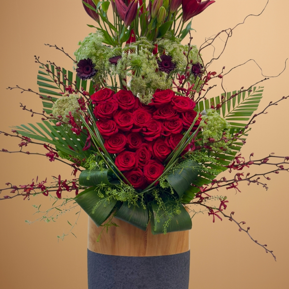 Roses, ammimajus, mokara and gerbera in a grey pot.