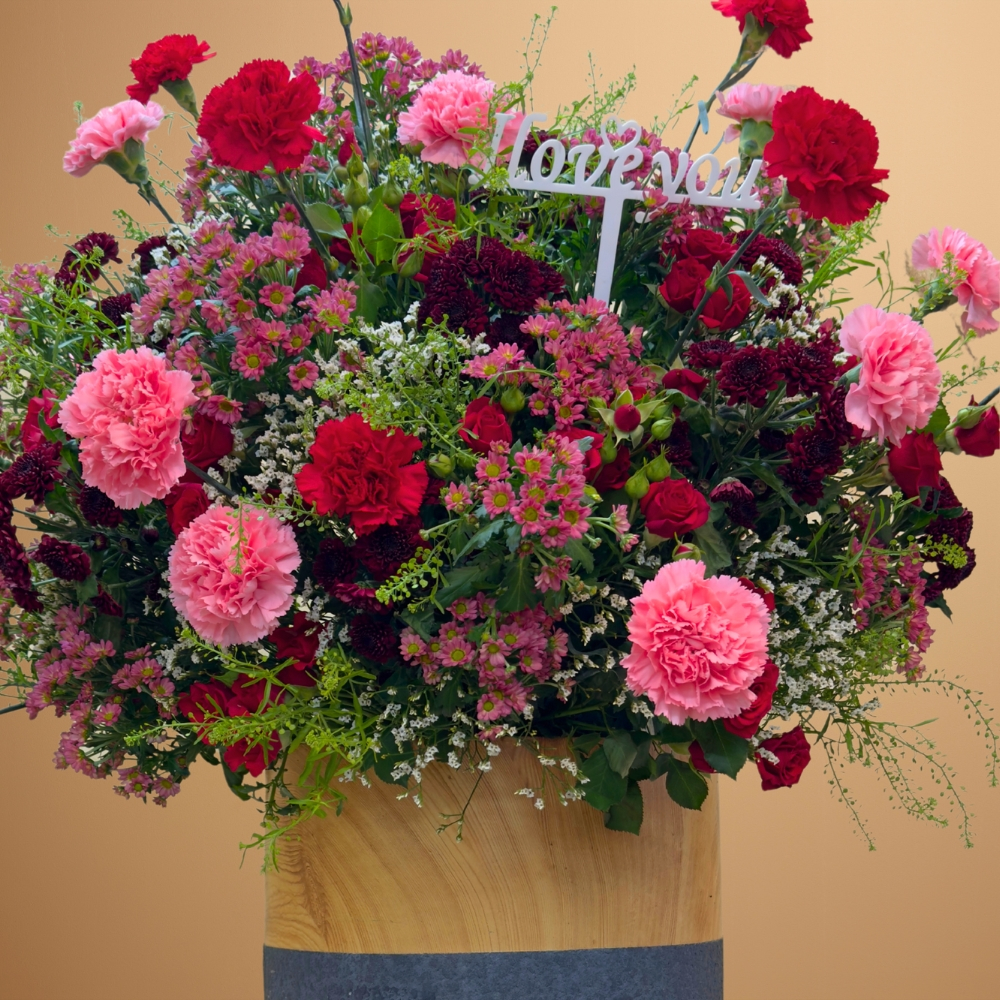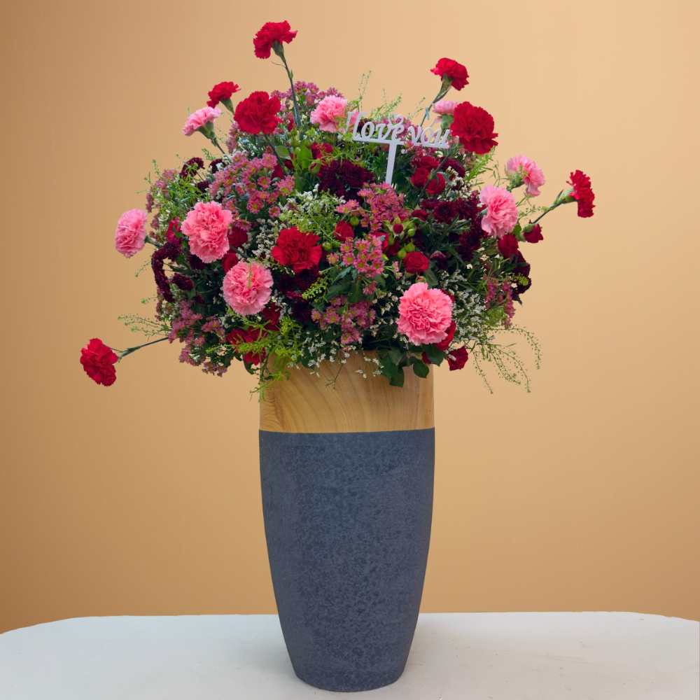 Chrysanthemum, carnation, res rose, limonium, lipedium filled in a grey vase.
