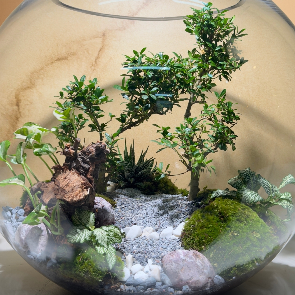 An ilex bonsai plant in a terrarium glass. Height: 40 cm. Width: 45 cm.