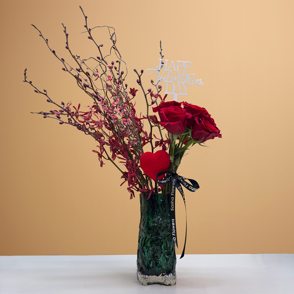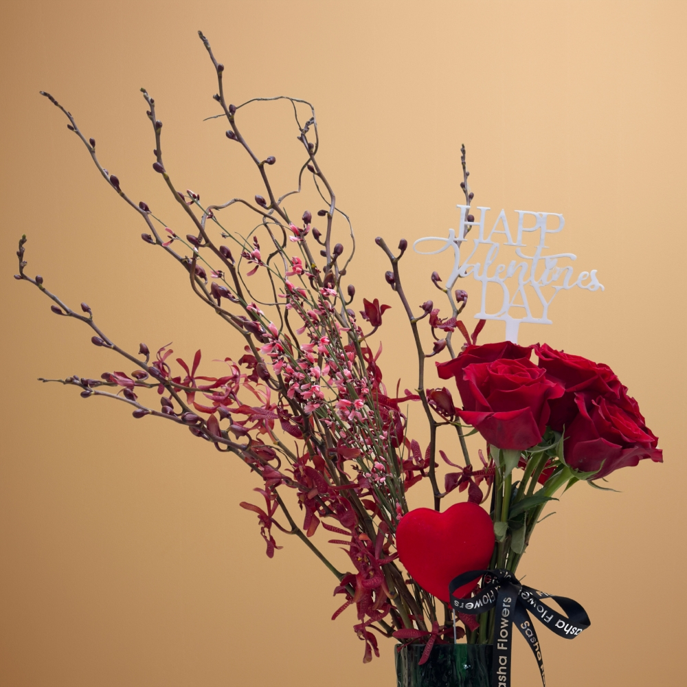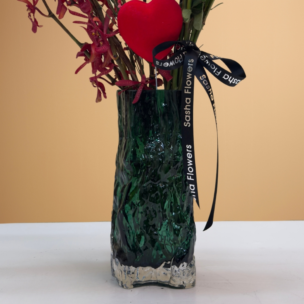 Red roses, mokara, and genista, beautifully arranged in a special glass vase. Perfect for adding a touch of sophistication to any space.