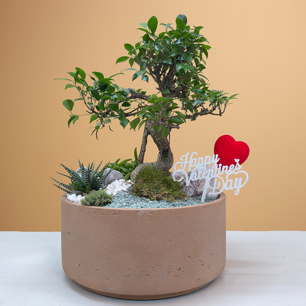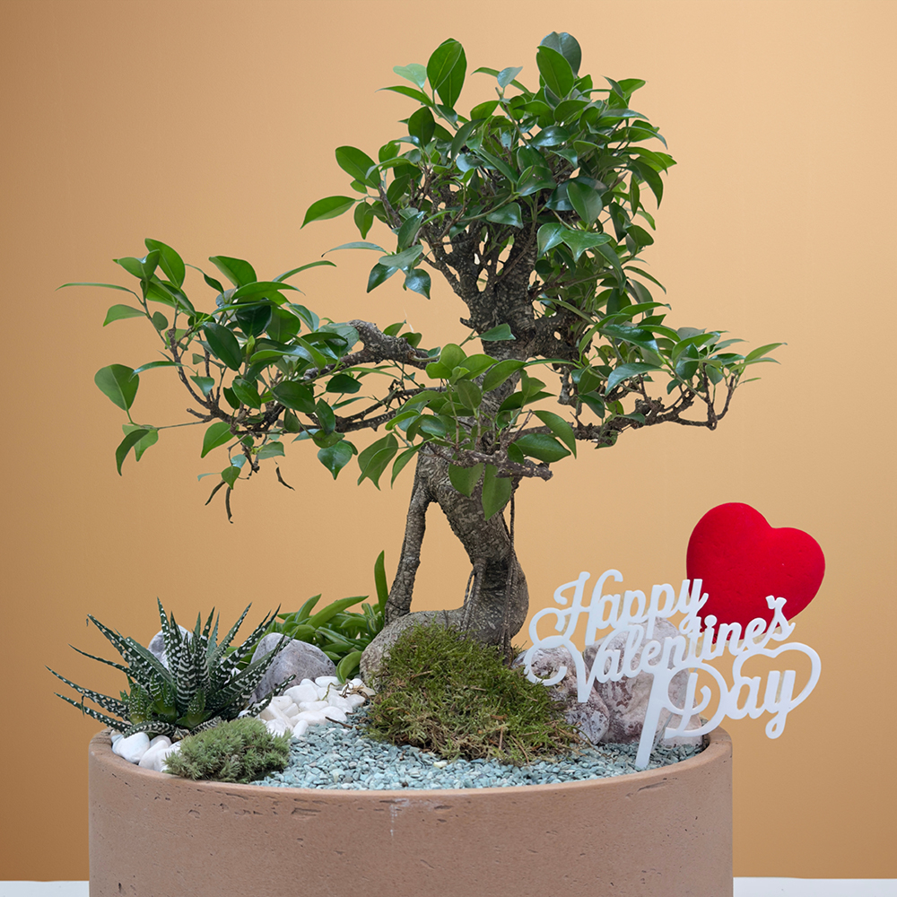 A beige pot arranged with ficus retusa bonsai, complemented by peperomia happy bean and haworthia, creating a calm and elegant plant arrangement.