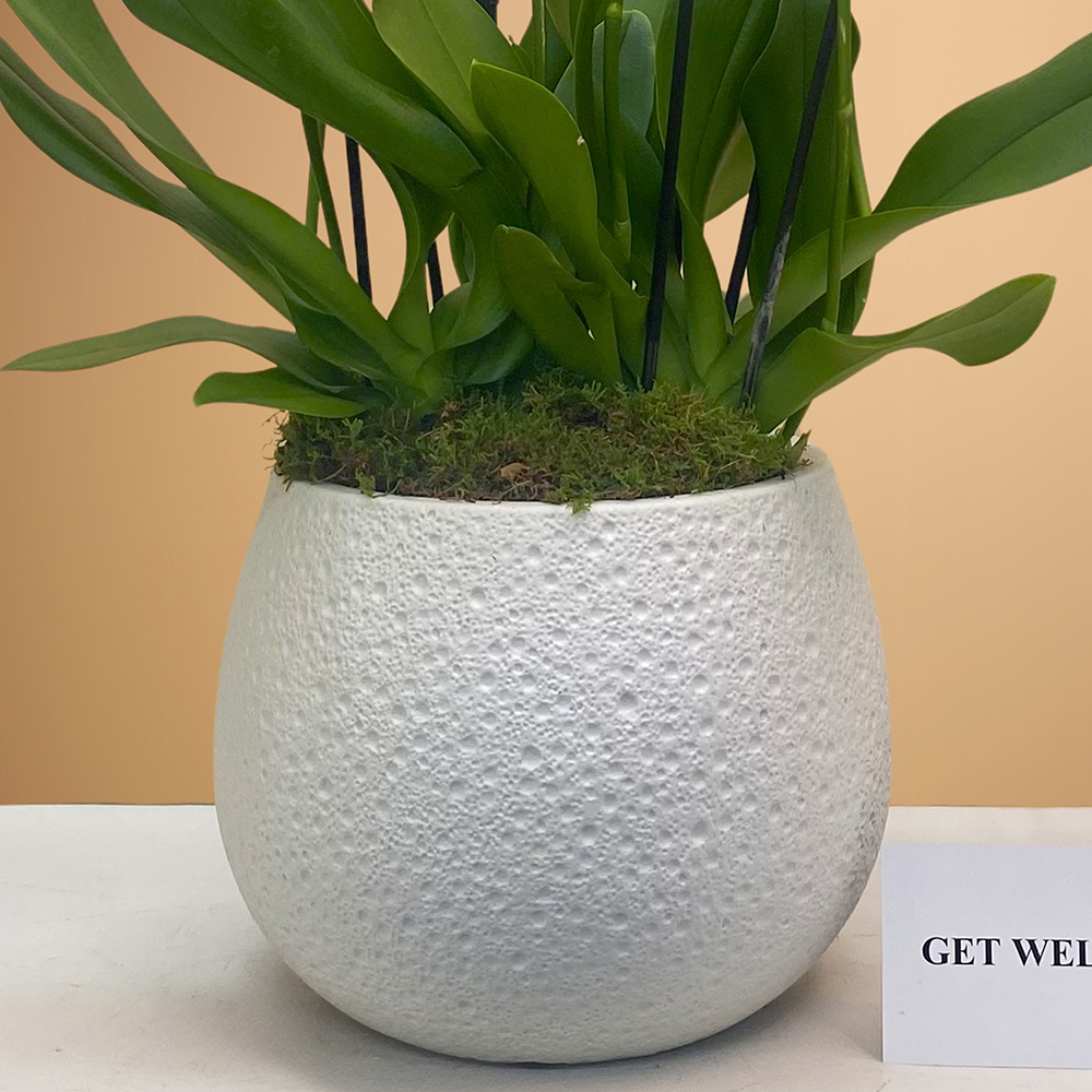 A bouquet containing white orchid plants, arranged beautifully in a ball-shaped pot.