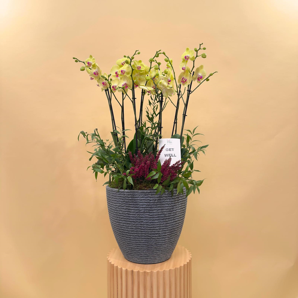 A pot filled with yellow lime light orchid plants red calluna, and ruscus leaves.