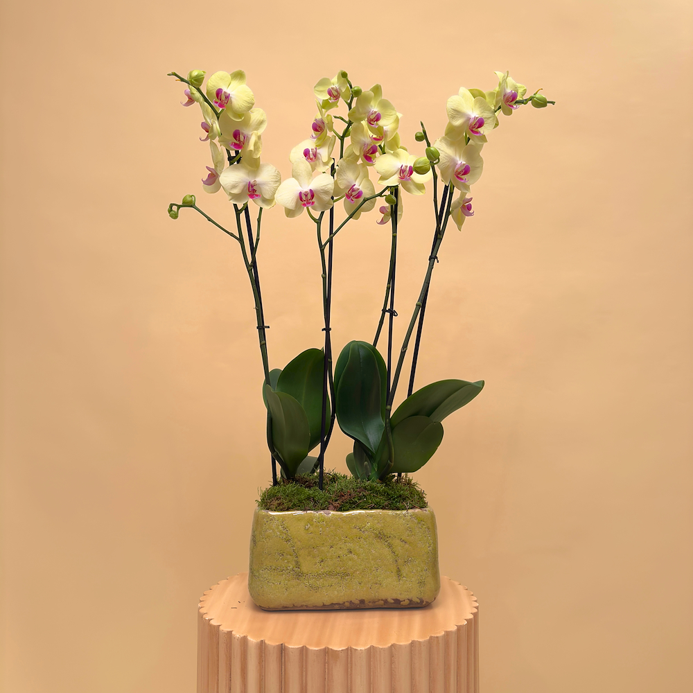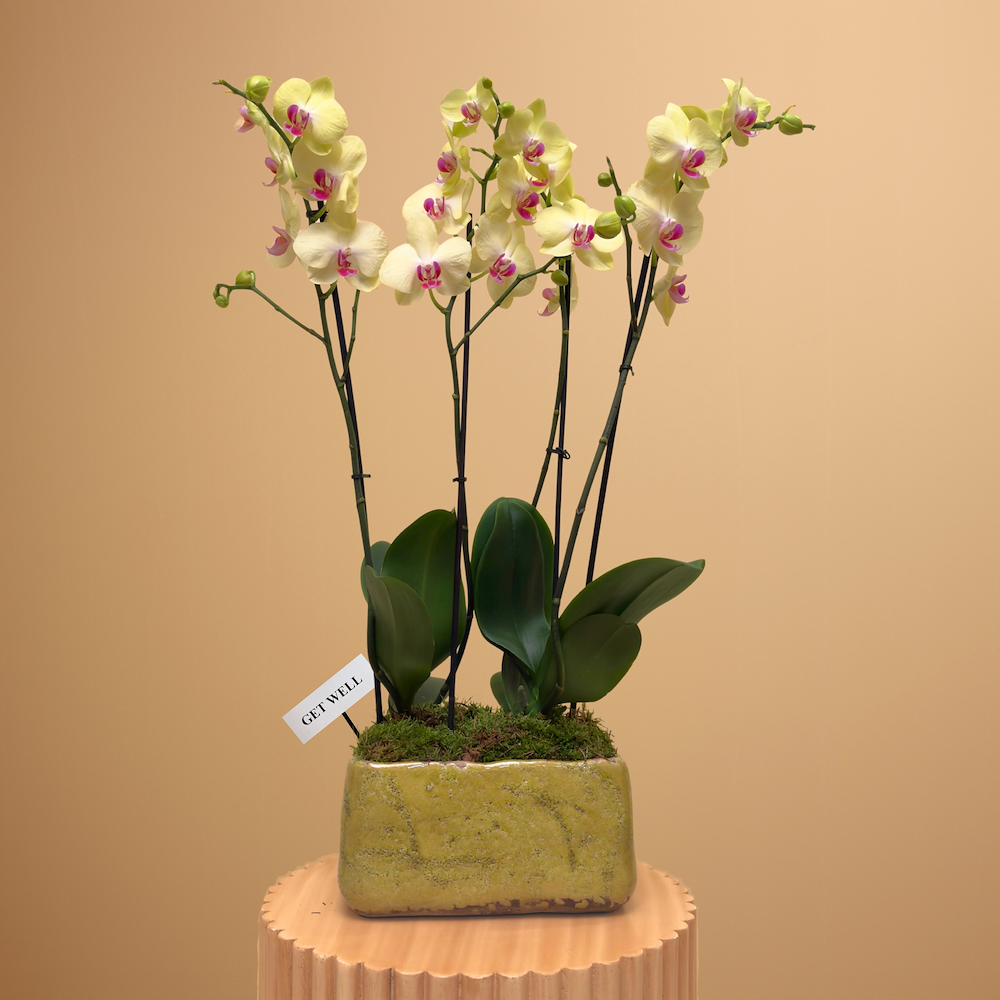 A ceramic vase filled with yellow orchid plants.