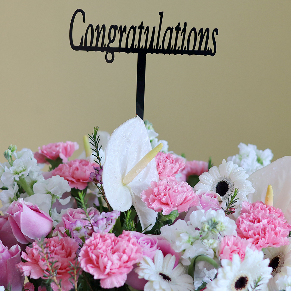A bouquet containing roses, matthiola, gerberas, chrysanthemums, carnations, anthuriums, and wax flowers, arranged beautifully in a round vase.