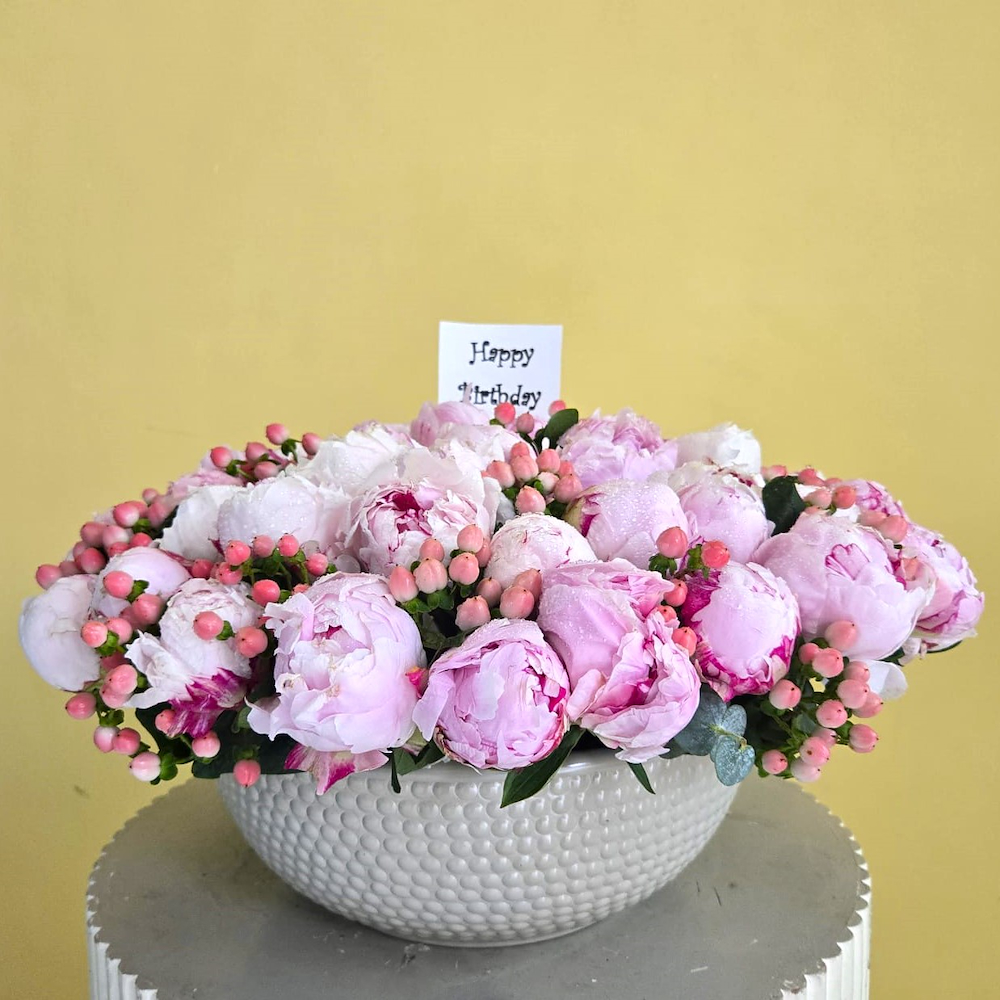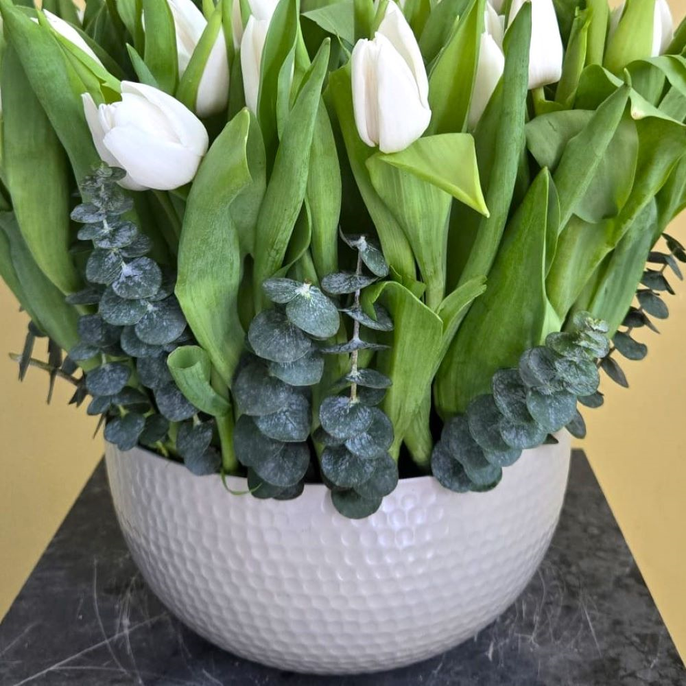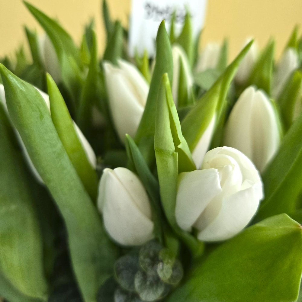 A beige vase beautifully arranged with white tulips.