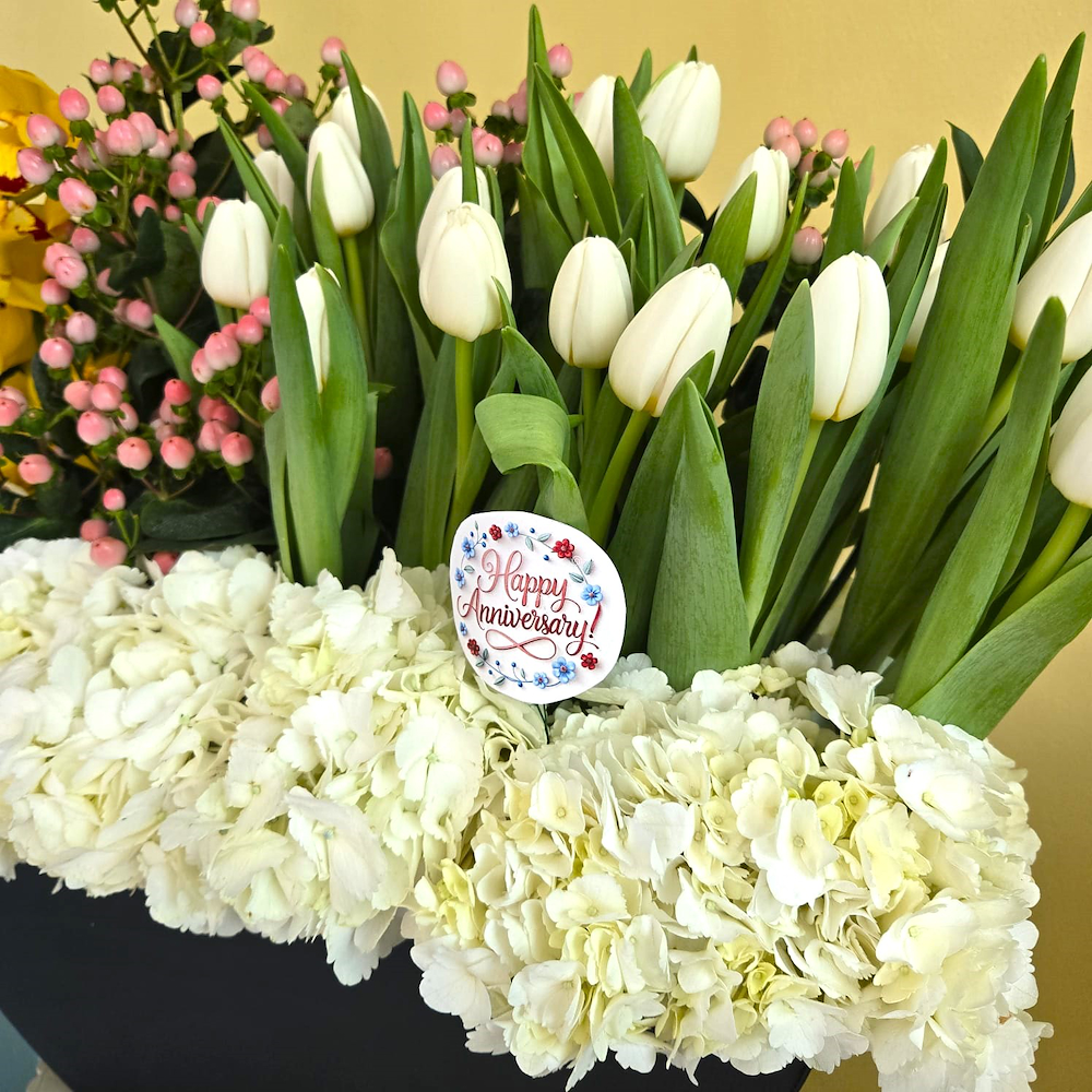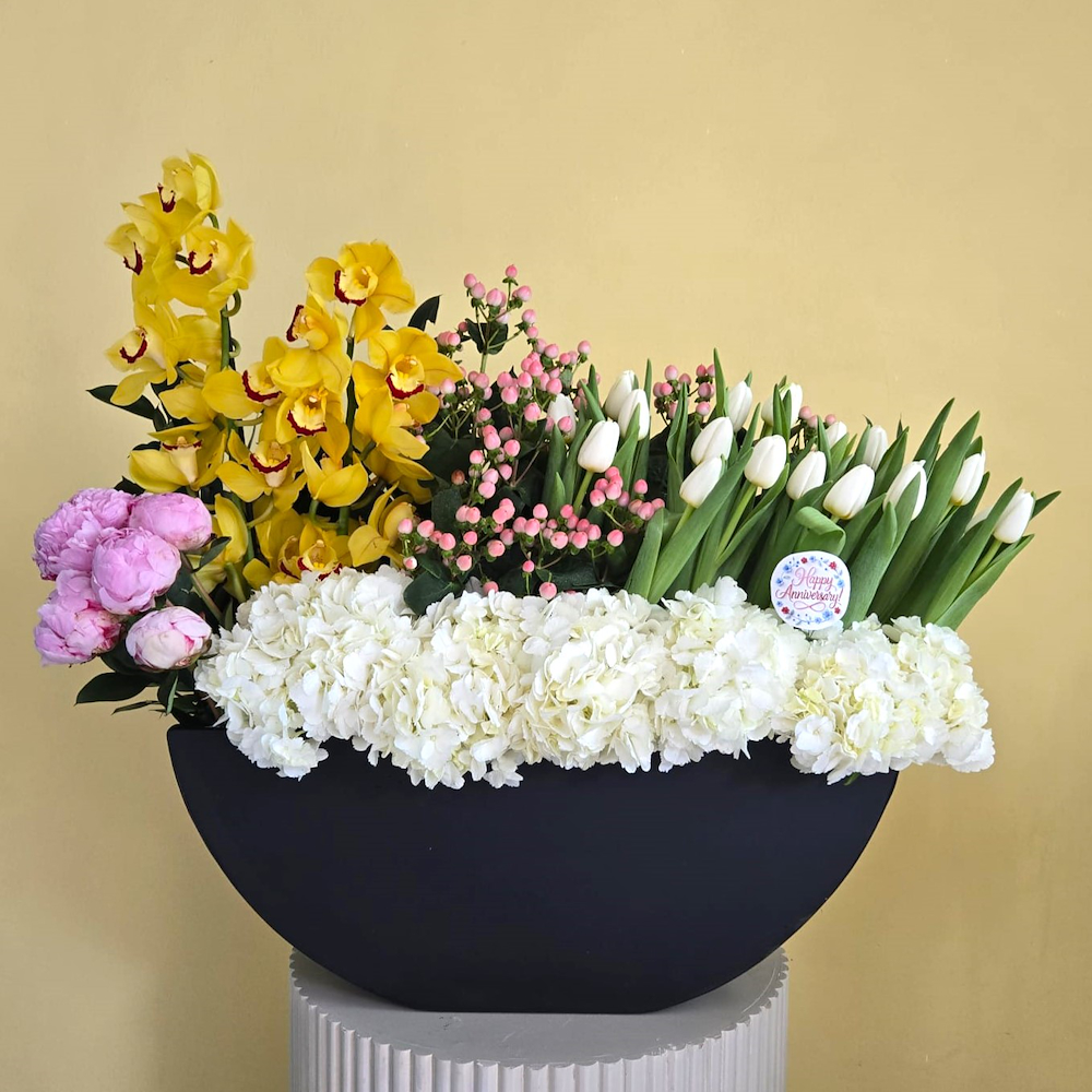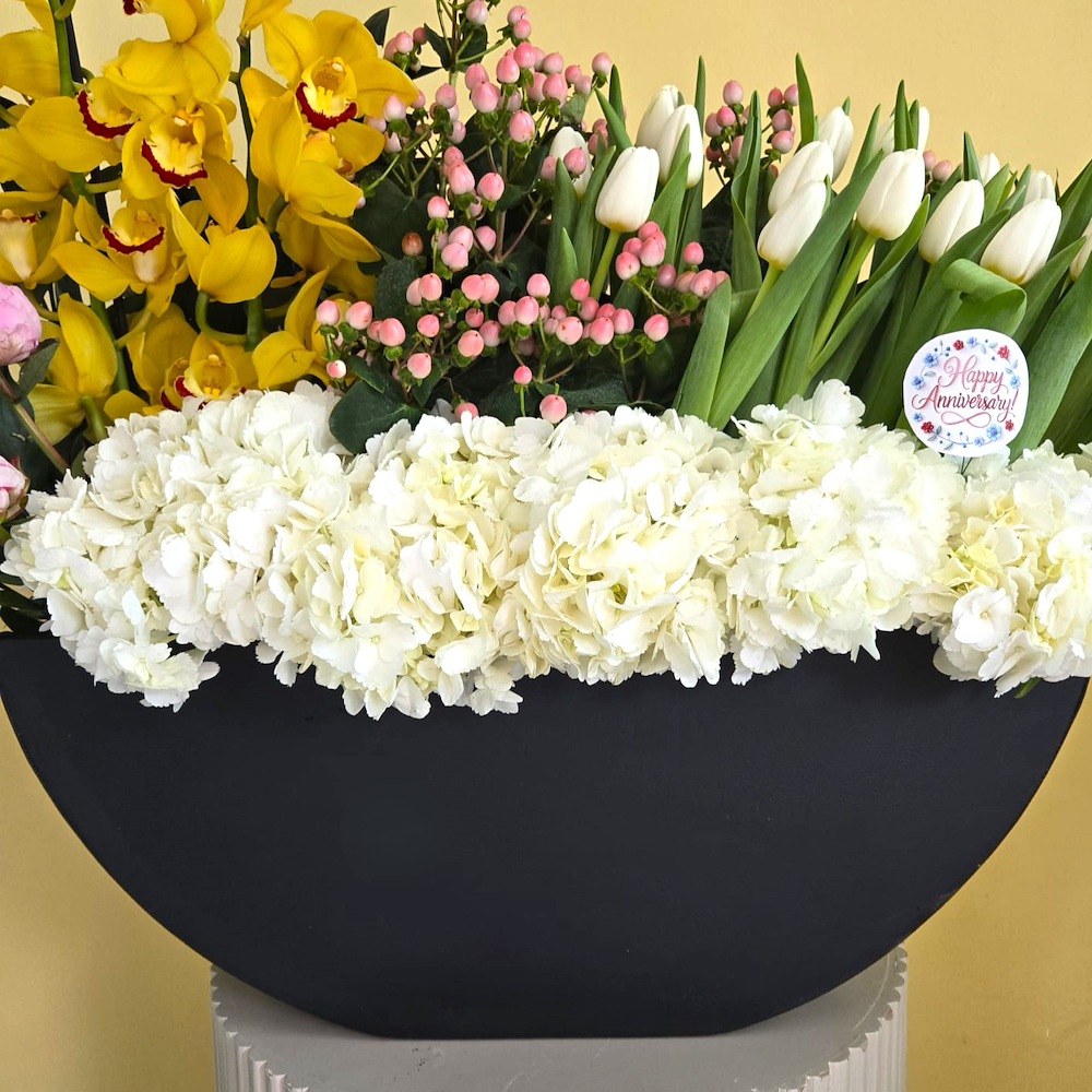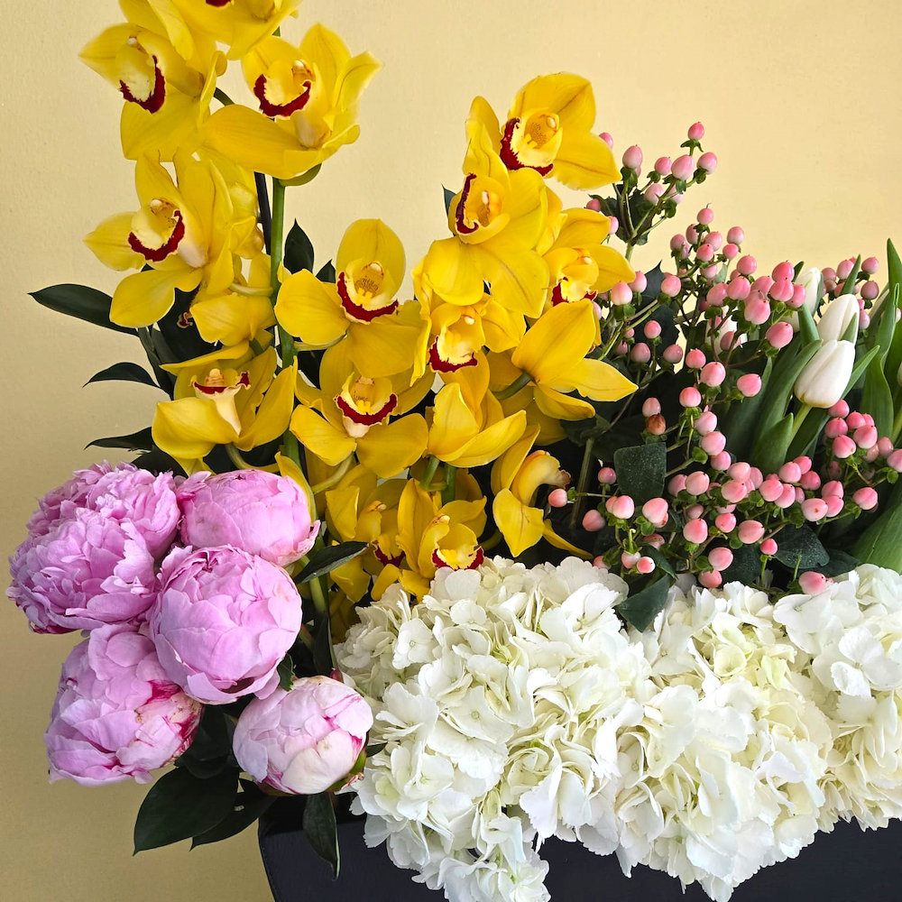 This bouquet contains yellow cymbidium, pink peonies, white tulips, pink hypericum and white hydrangeas in a black leather vase.