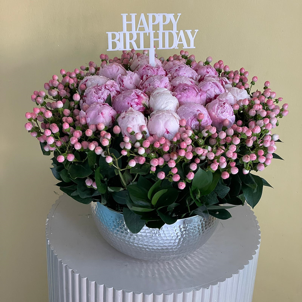 A bouquet of Ilex, hydrangeas, spray roses, alstroemeria with hypericum in a gray vase.
