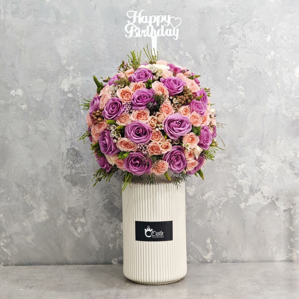 A bouquet containing pink alstroemerias, baby roses, baby chrysanthemums, hydrangeas, and peonies, arranged beautifully in a vase.