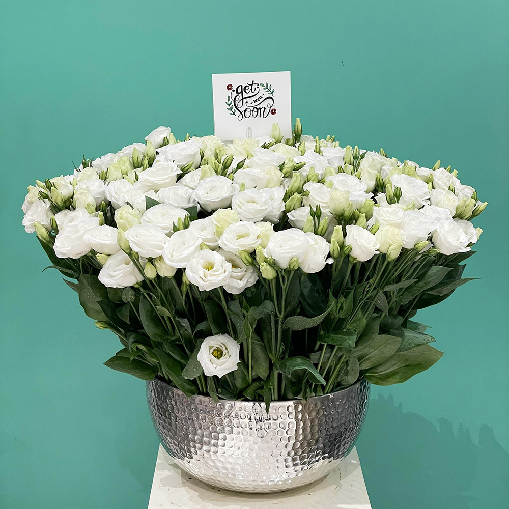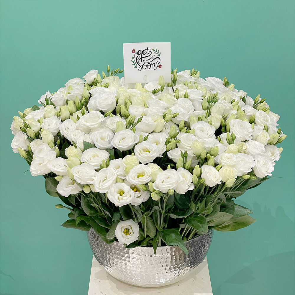 A bouquet containing lisianthus flowers, arranged beautifully in a vase.