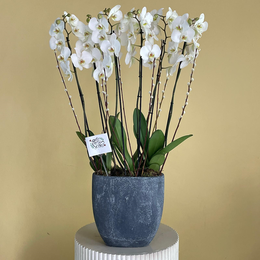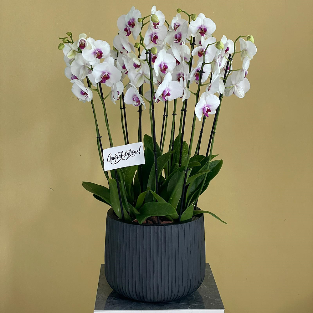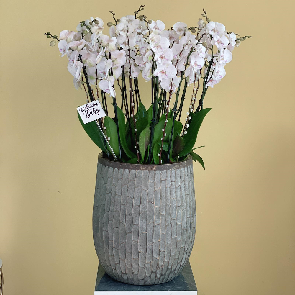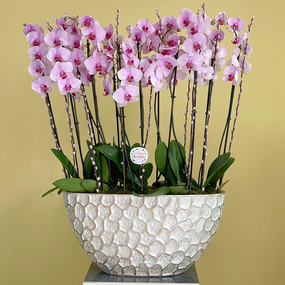 A vase filled with lite pink orchid plants.