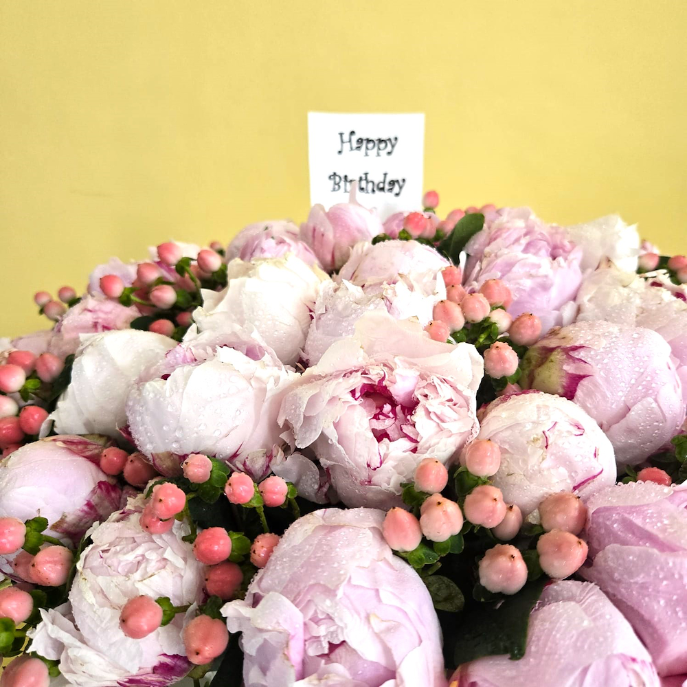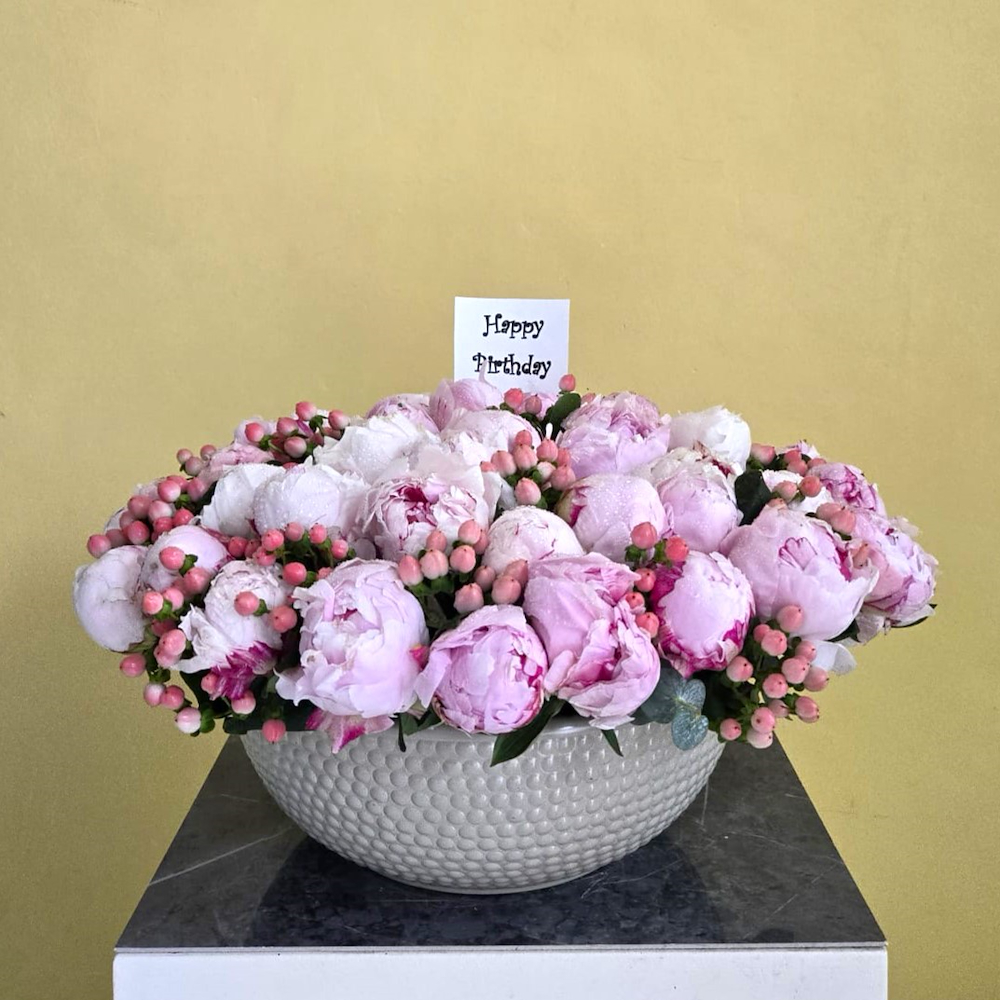 Pink peonies, hypericum, and green leaves, beautifully arranged in a beige round vase.