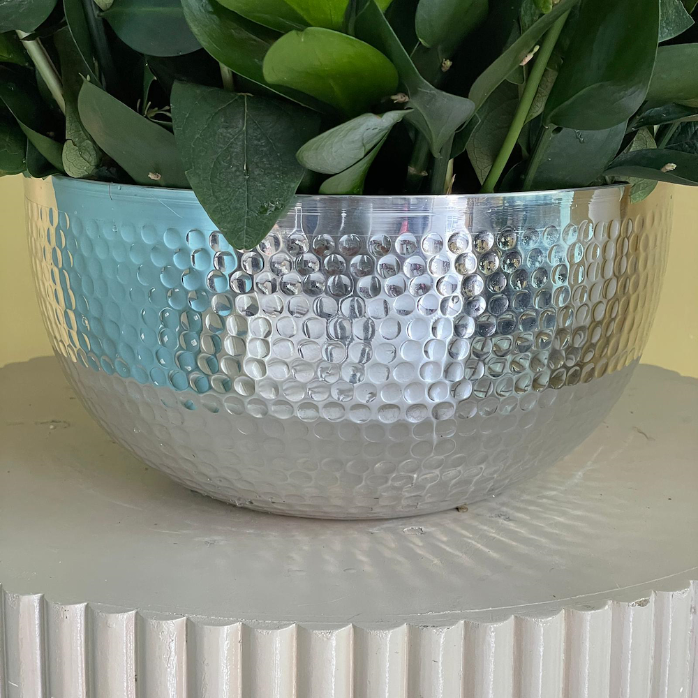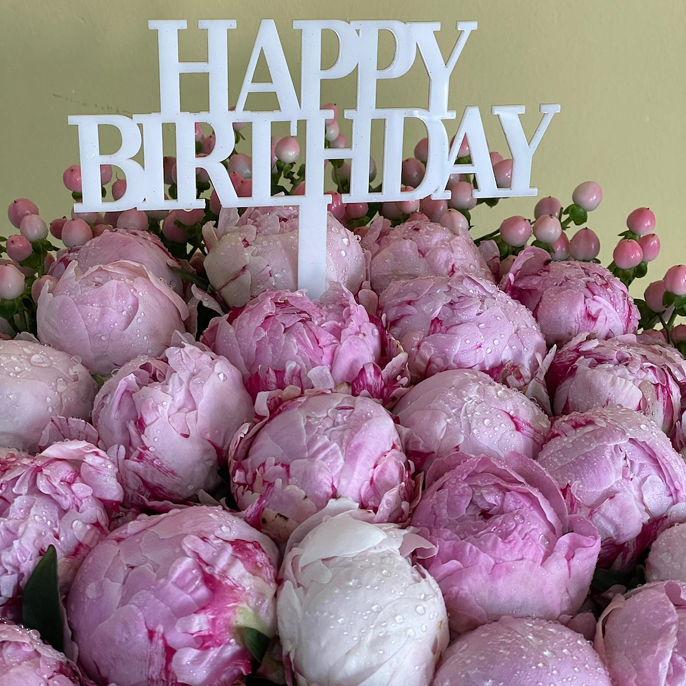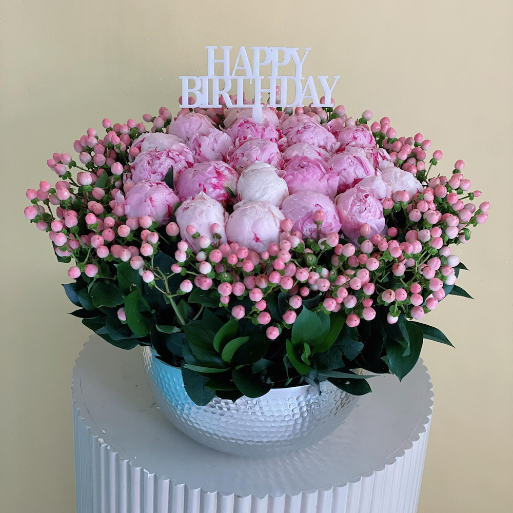 Pink peonies, hypericum, and green leaves, beautifully arranged in a beige round vase.