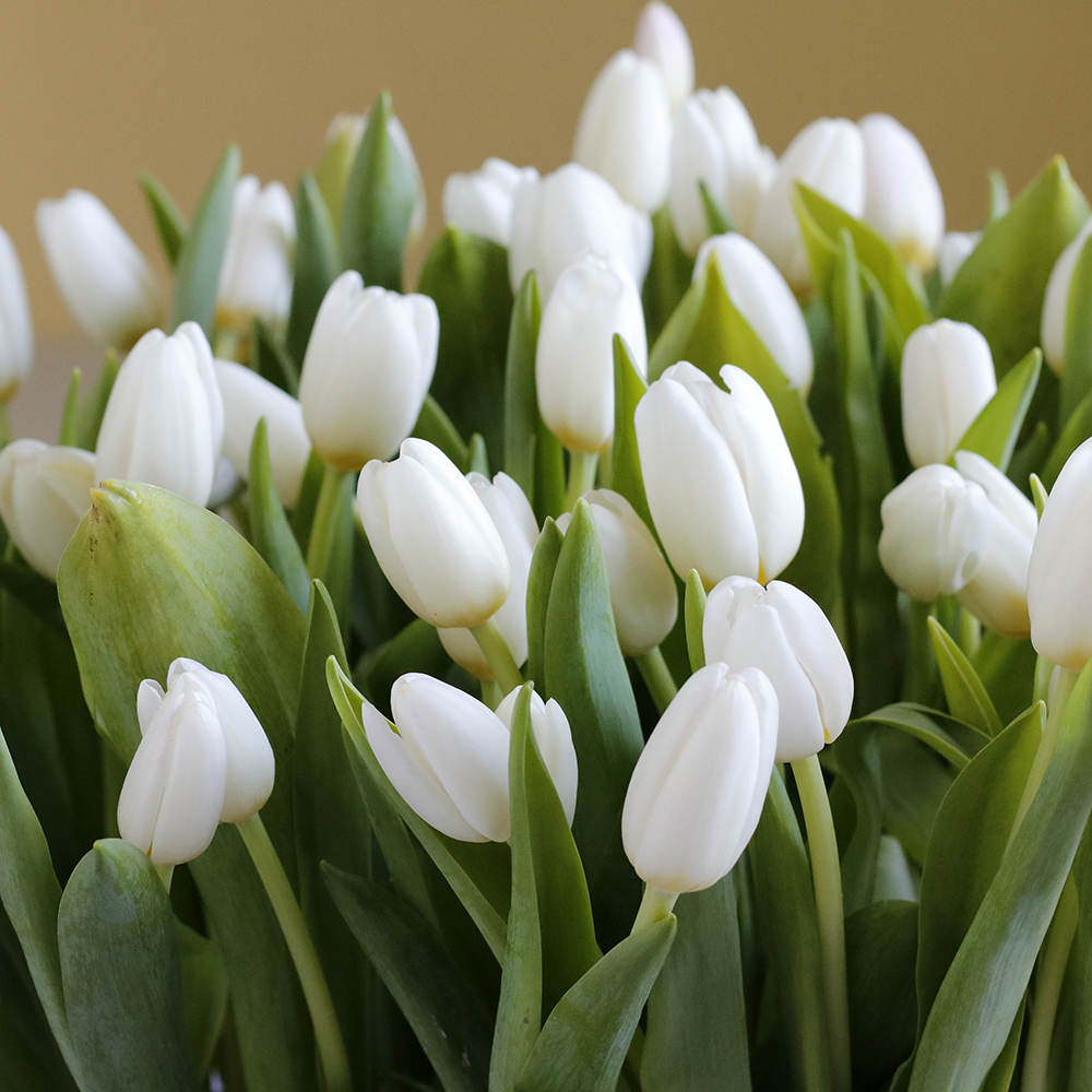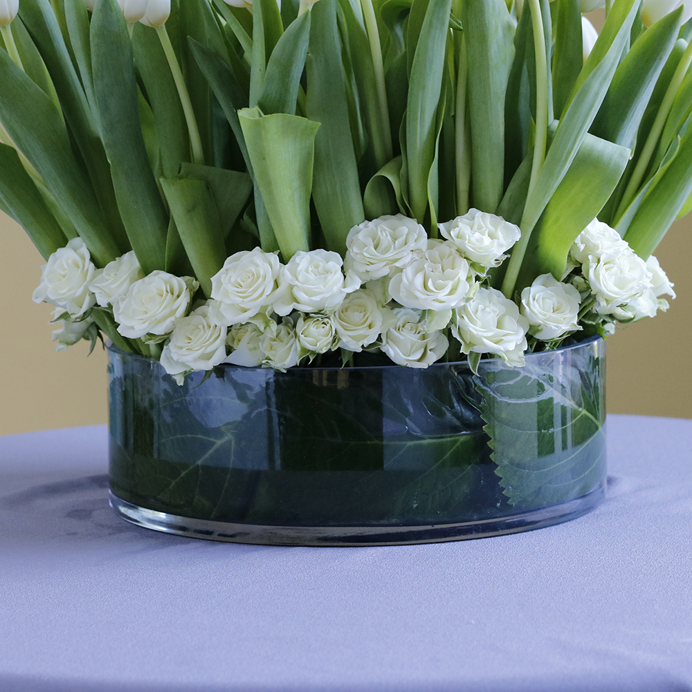 A bouquet containing white baby roses and tulips, arranged beautifully in a luxurious vase.