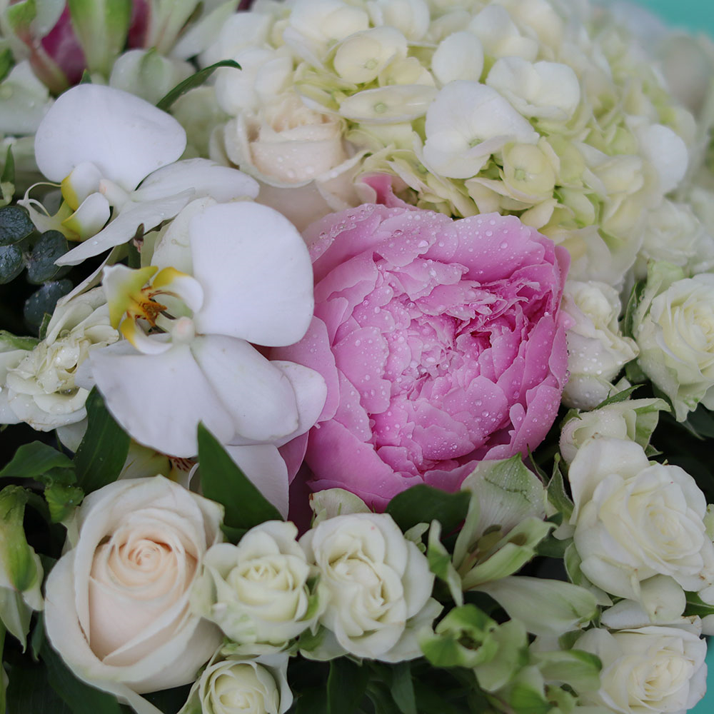 This bouquet contains hydrangeas, peony, roses and baby roses in a amazing vase.