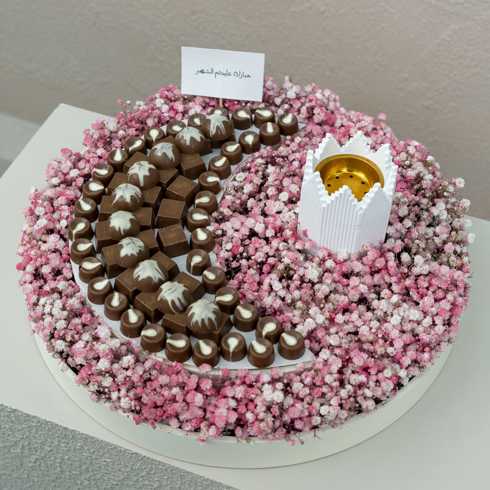 This bouquet contains baby roses and carnations with a chocolate cake.