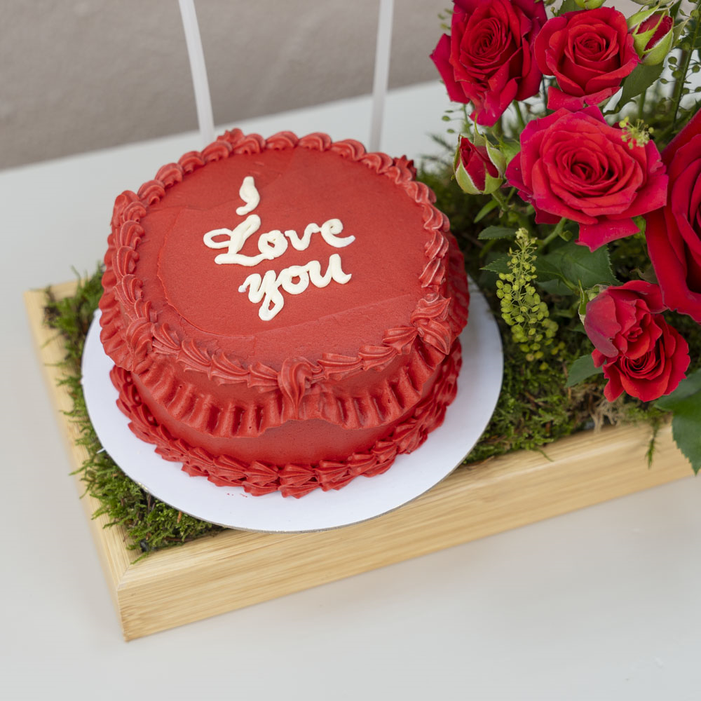 A wood tray styled with roses, baby roses and balloons with a chocolate bento cake.