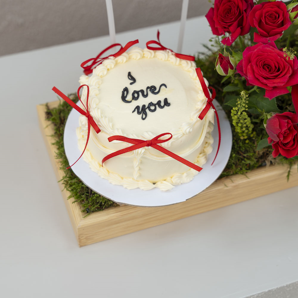 A wood tray styled with roses, baby roses and balloons with a chocolate bento cake.