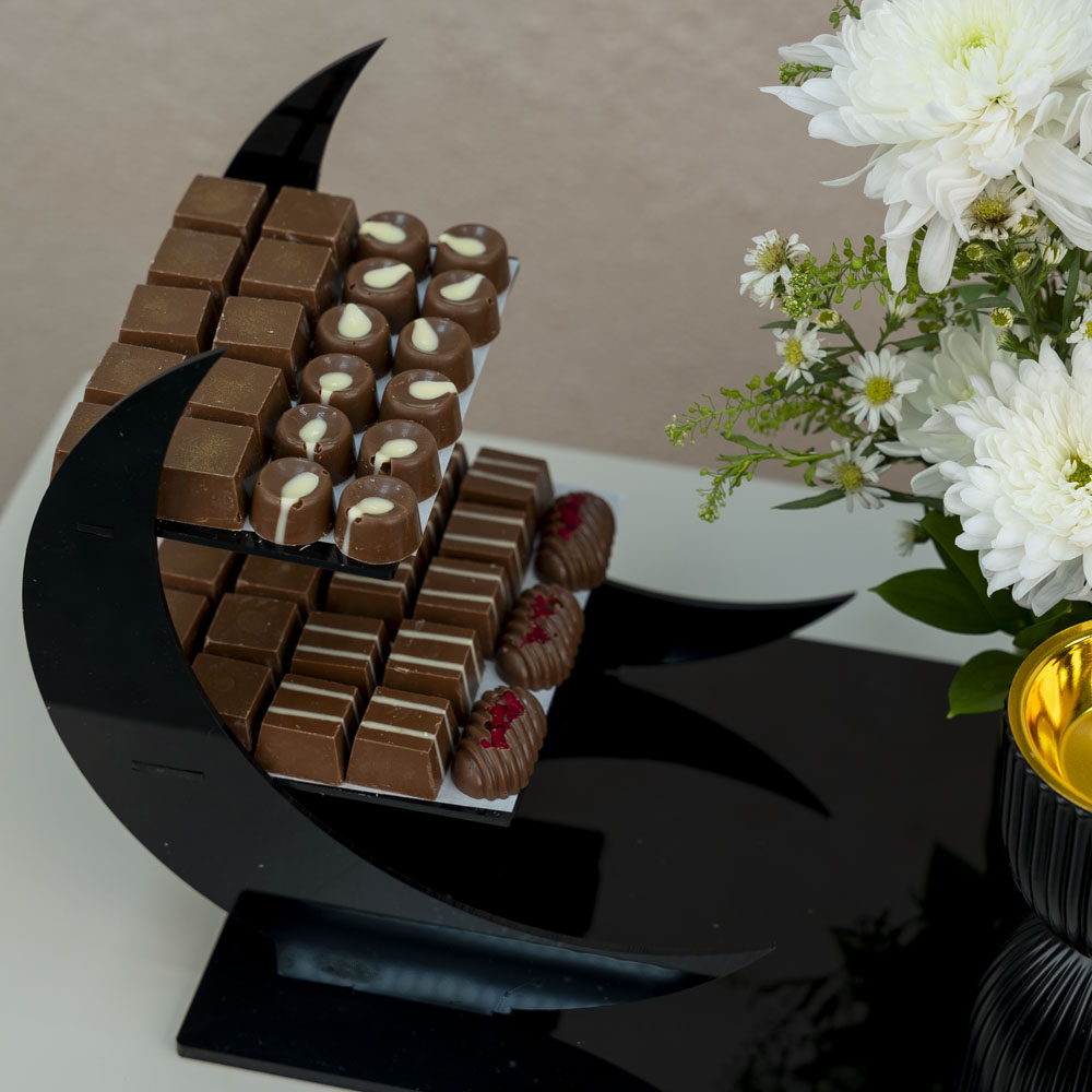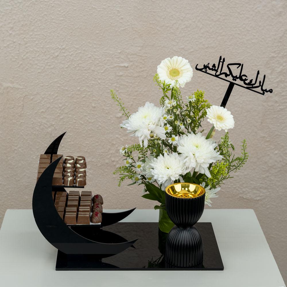 A luxurious acrylic tray adorned with gerbera and chrysanthemum flowers, with assorted Belgian chocolates and a mubkhar.