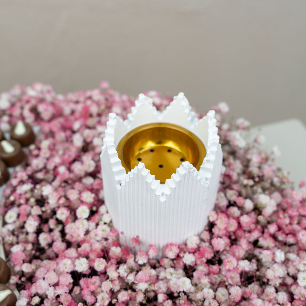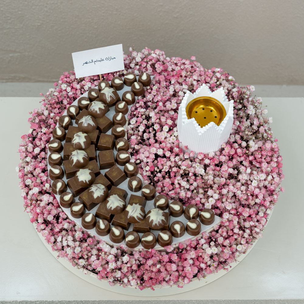 A wooden tray decorated with gypsophila flowers in the shape of a Ramadan crescent, filled with Belgian chocolates with various fillings, and a luxurious steamer.