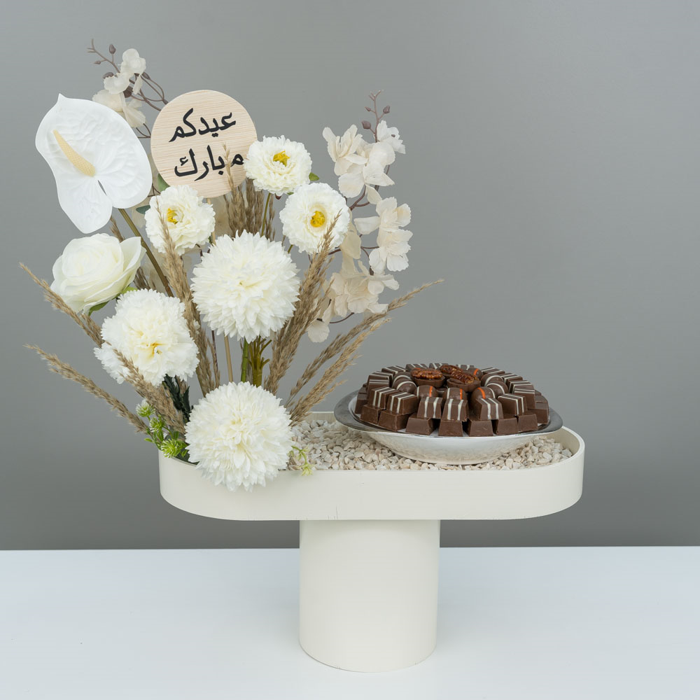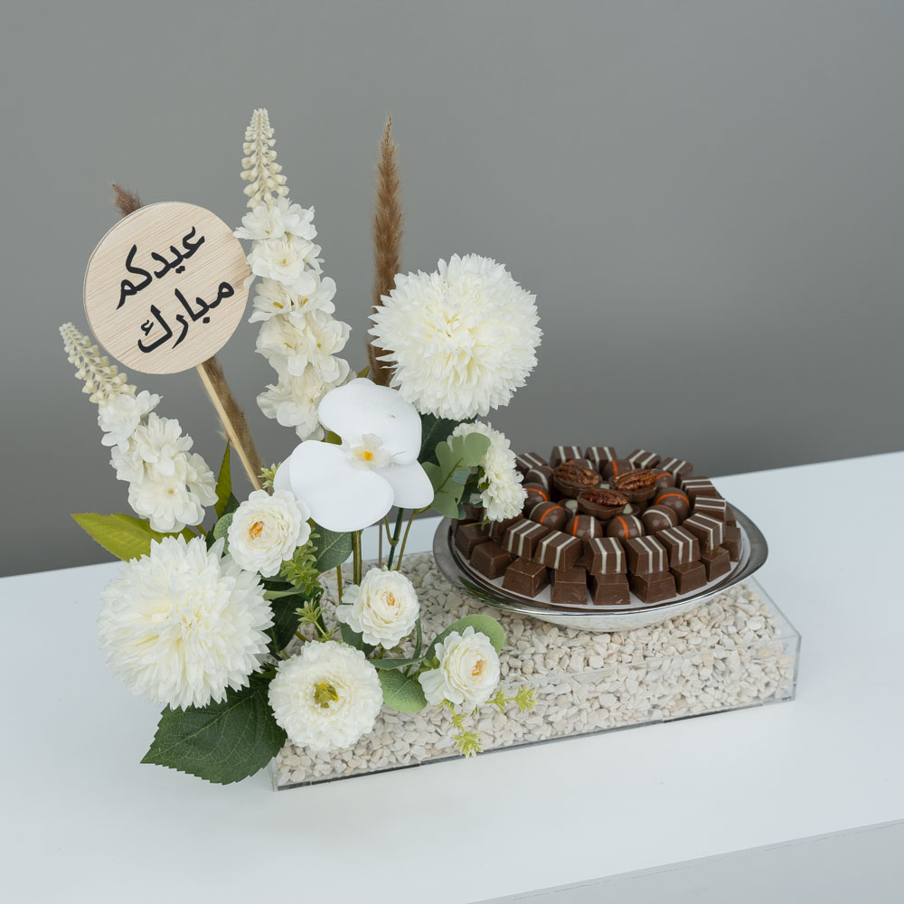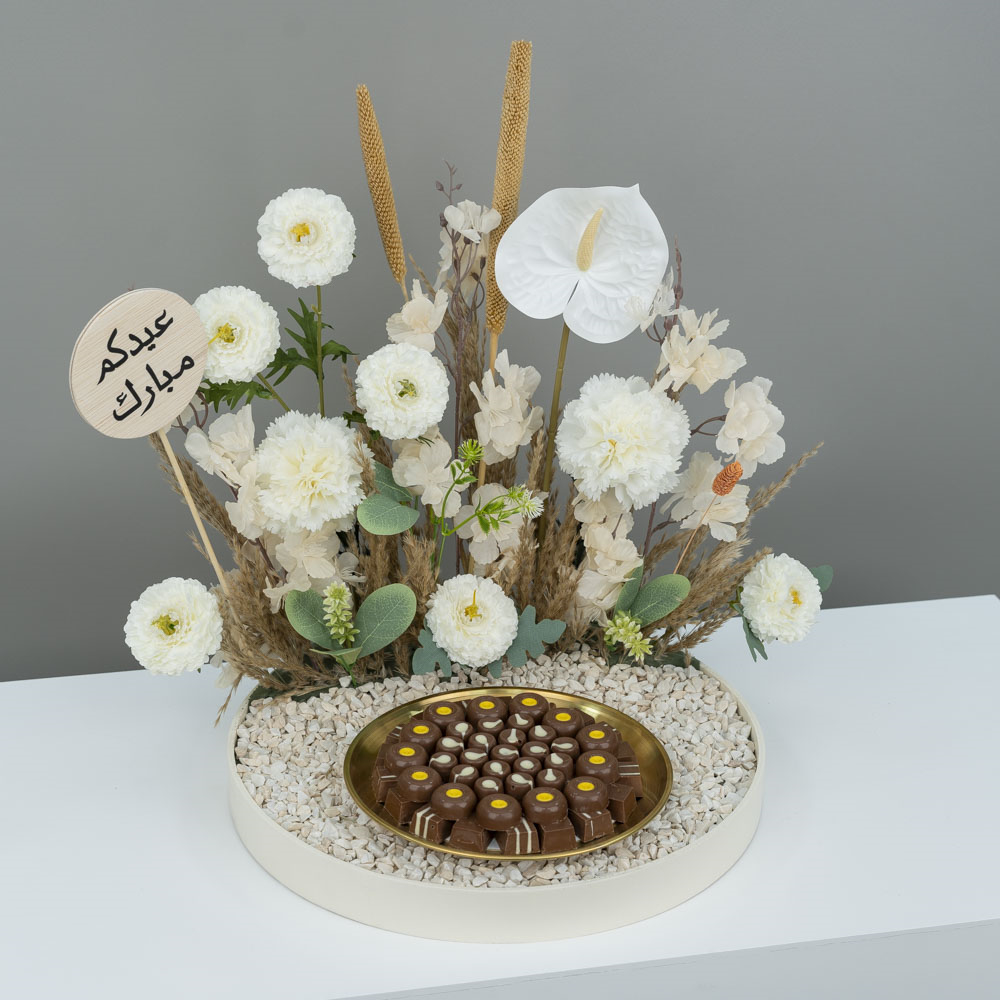 A bouquet containing roses with 6 small cups containing chocolate cake.