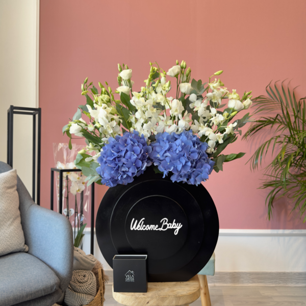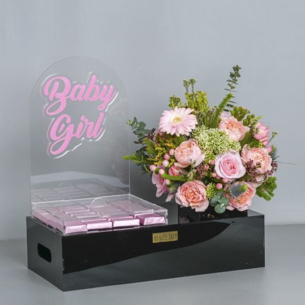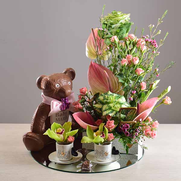 This bouquet contains alstroemeria and roses with chocolates.