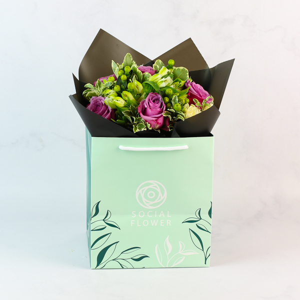This hand bouquet contains mixed flowers.