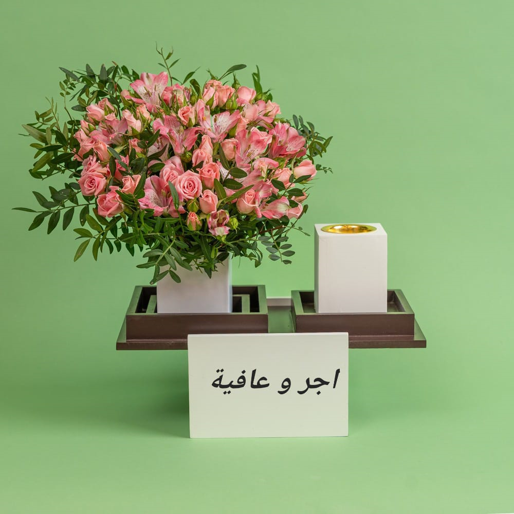 A bouquet featuring roses and alstroemeria flowers with a mubkhar.