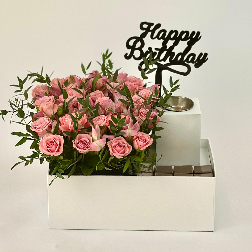 A box that contains alstroemerias, chrysanthemums, and baby roses with chocolates and an incense burner.