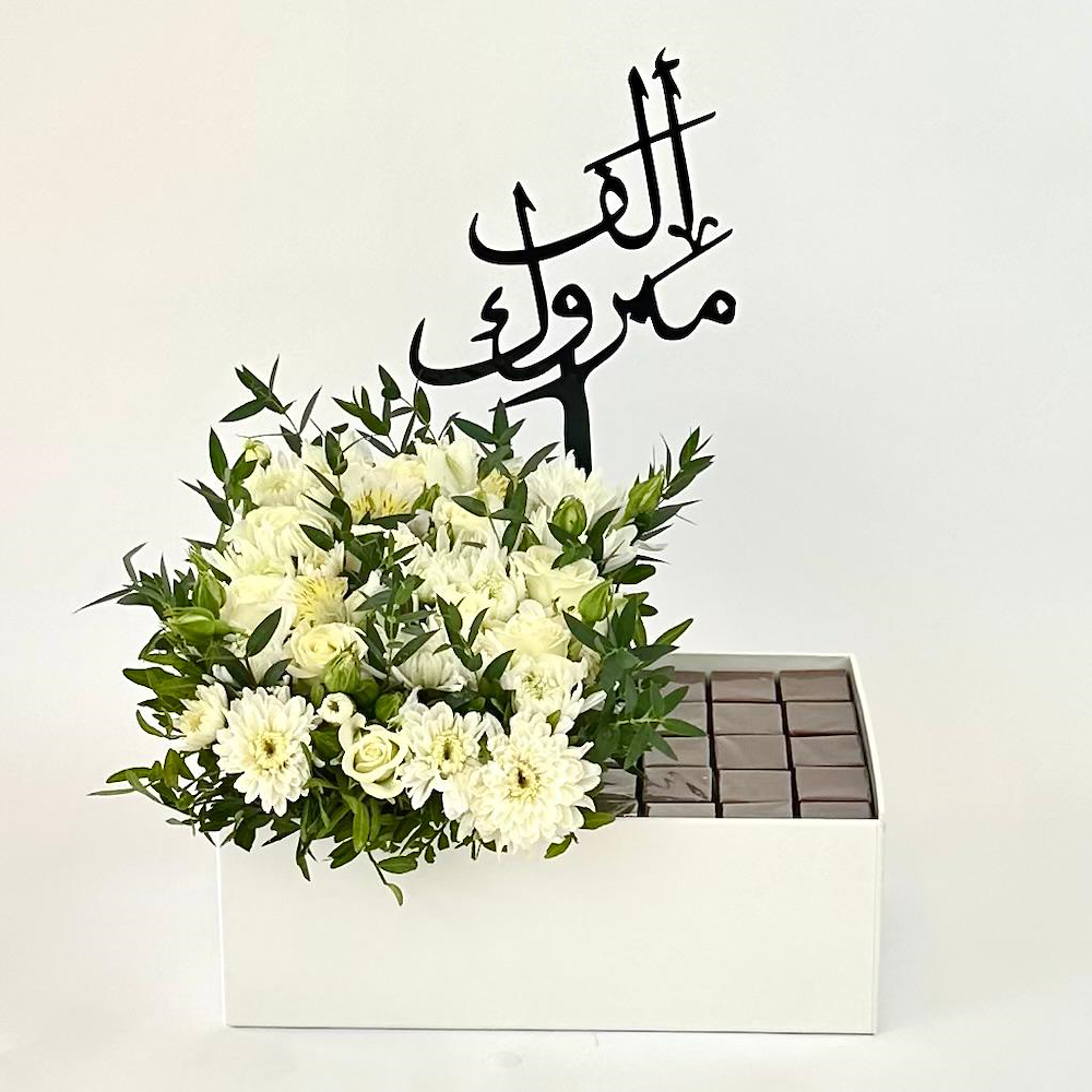 A blooms box that contains alstroemeria and chrysanthemums with chocolate and a mubkhar.