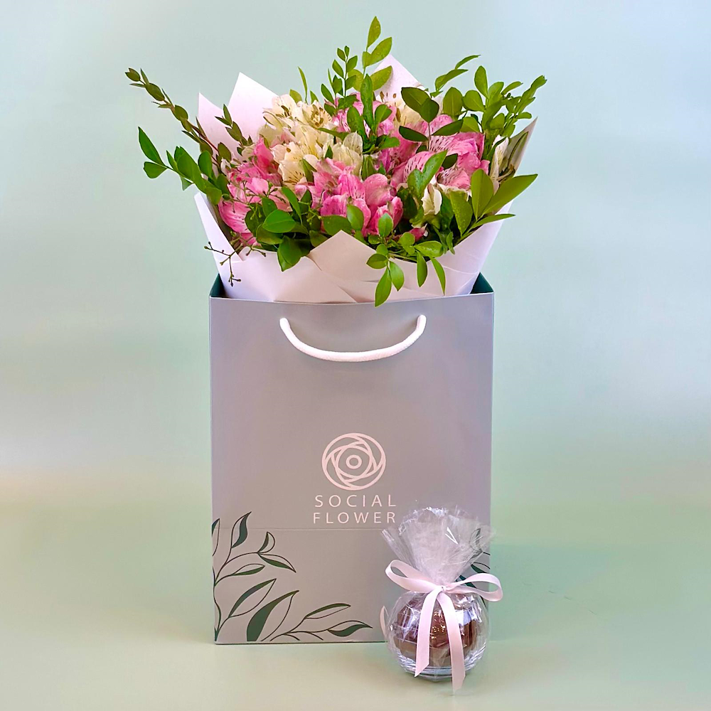 This bouquet contains alstroemeria with chocolates.